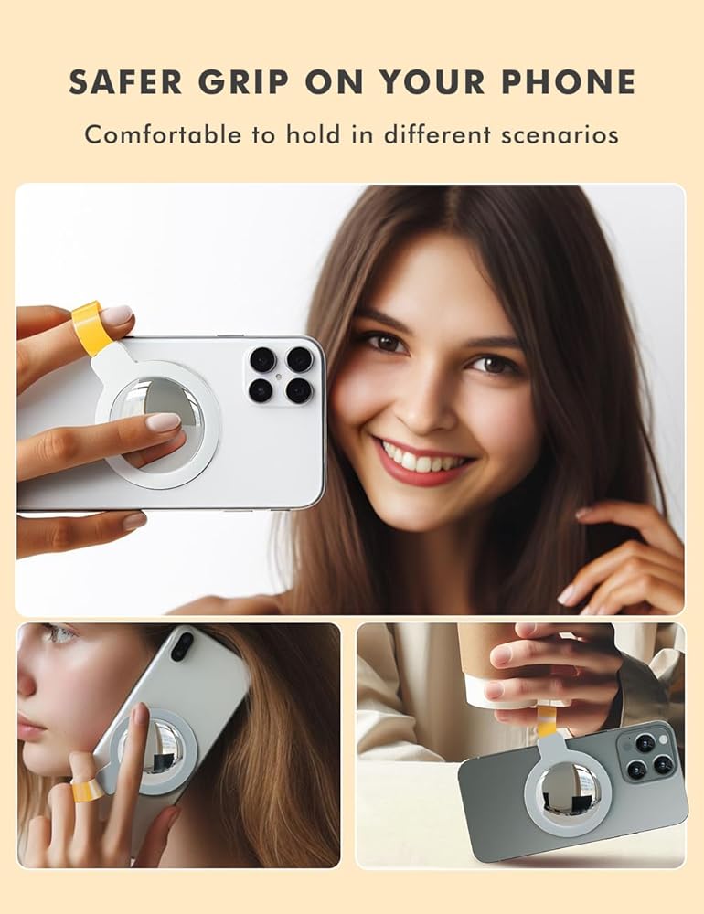 【BEST MAGNETIC BALANCE】Mag safe Magnetic Phone Convex Mirror features a powerful N52 magnet that is precisely attached to the back of your phone, paired with a ring design, made of silicone material that fits comfortably to your fingers, provides better grip and reduces the risk of slipping while holding the phone.