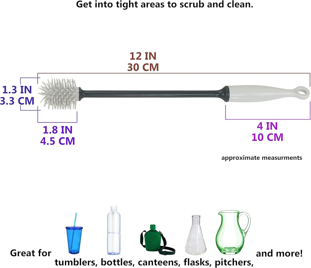 Keep your cups, bottles, and more clean the easy way with these silicone bottle brushes from Iconikal! These mini bottle brushes effectively clean and scrub bottles by getting into tight areas where your hands can't reach! Non-scratch silicone bristles are great for cleaning tumblers, bottles, canteens, flasks, pitchers, and more! Brush measures approximately 1.3 inches wide by 1.8 inches long (1.3" W x 1.8"L); handle measures approximately 4 inches long (4"L); total length approximately 12 inches long (12" L). Includes (2) bottle brushes.