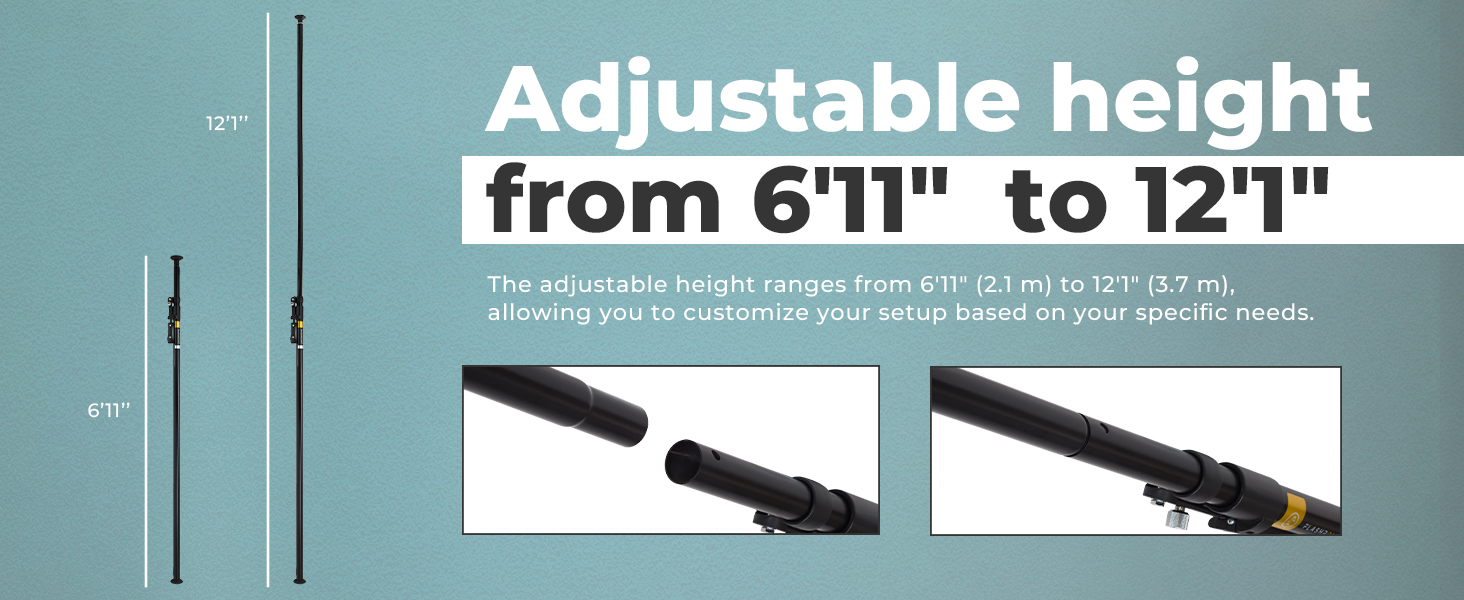 Engineered for versatility, these telepoles can be easily and swiftly mounted between the floor and ceiling, creating a functional studio backdrop and grip system. The adjustable height ranges from 6'11" (2.1 m) to 12'1" (3.7 m), allowing you to customize your setup based on your specific needs.