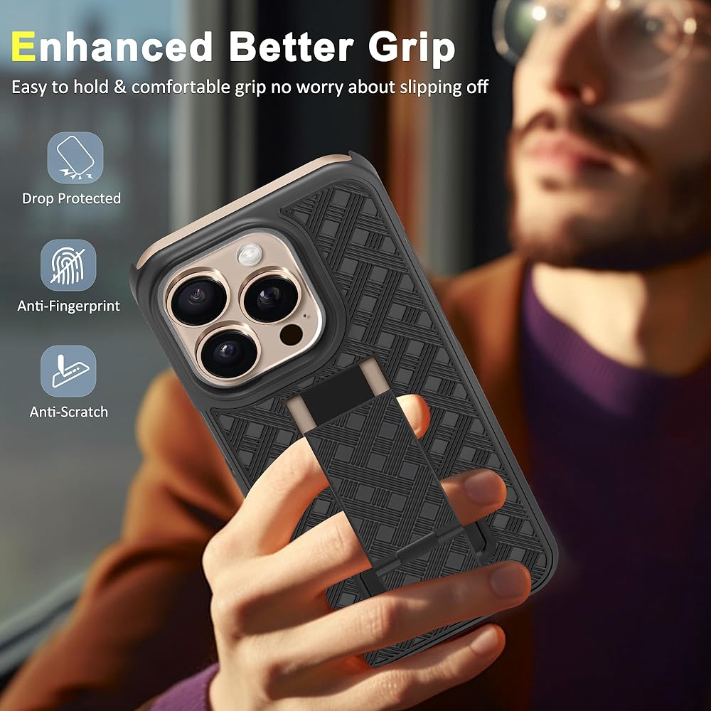 The belt clip phone case iPhone 16 Pro is made with premium rubberized texture, which gives you added protection and makes gripping your phone very easy; and a soft felt lining further protects the screen from scratches or abrasions when the phone is encased in the holster