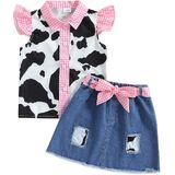 - Feature: western outfit for girls, baby girl clothes, shirt: button down, ruffle sleeve, cow print and plaid print, lapel collar, matching with denim skirts with plaid print belt, elastic waistband, cow print, pull-on closure, easy to put on and take off.2pcs baby girl denim set, toddler girls clothes, cow print top sleeveless, cow print shirt toddler, denim jeans skirt set.