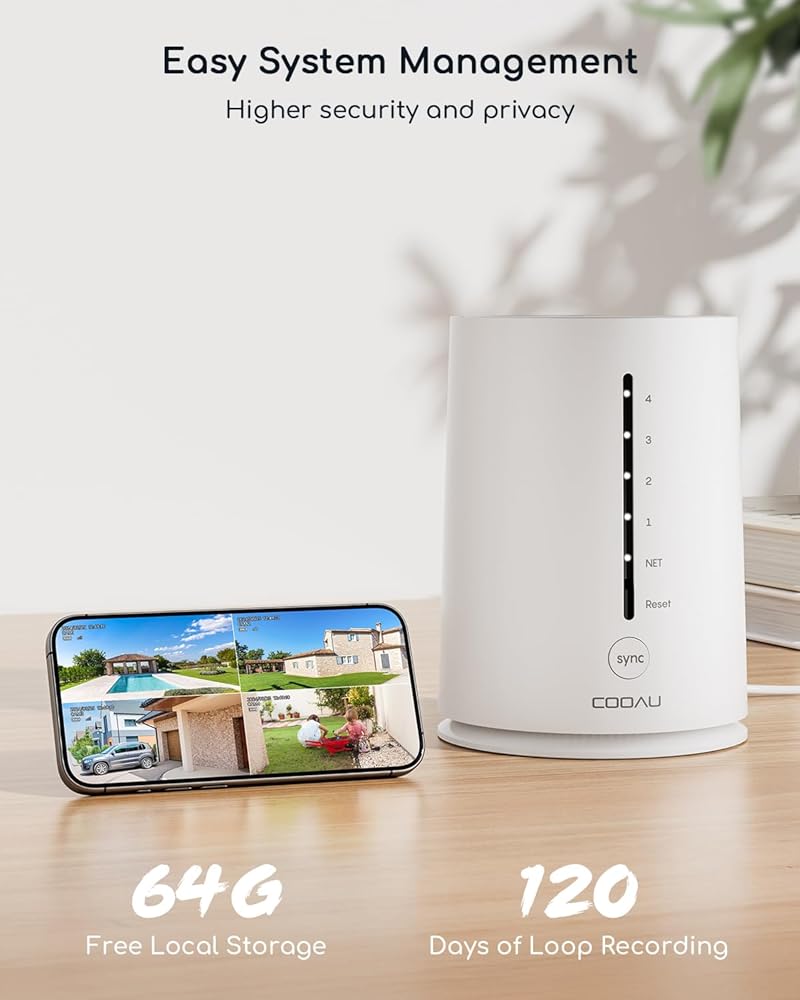 【Secure Storage】The COOAU HomeBase system comes with a 64G Memory Card where you can store secure recordings. This means you don't have to pay a monthly fee to view your recordings. By using local storage and storing your recordings on your HomeBase at home, you can keep your recordings off the Internet and reduce the risk of them falling into the wrong hands. You can expand the capacity of the Memory Card to store more recordings without being restricted by the limited built-in storage.