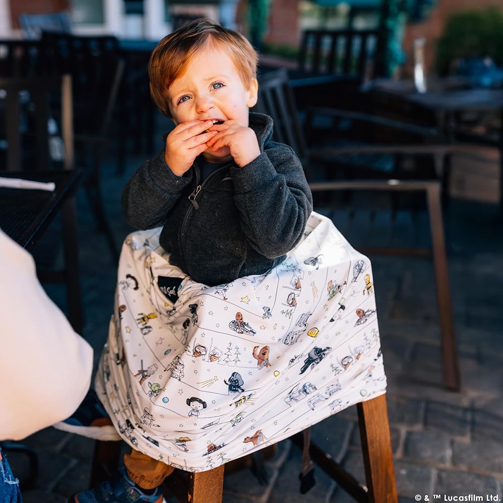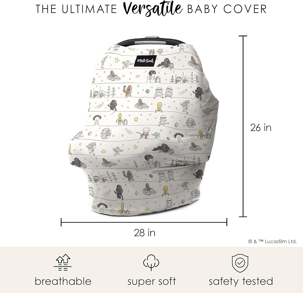 THE ORIGINAL 5-IN-1 COVER WITH ENCHANTING STAR WARS DESIGNS: Our multifunctional all-in-one cover featuring your beloved Star Wars characters that your little one will absolutely love. Can be used as a infant car seat cover, breastfeeding cover, nursing cover, stroller cover, shopping cart cover, high chair cover, car seat canopy and more!