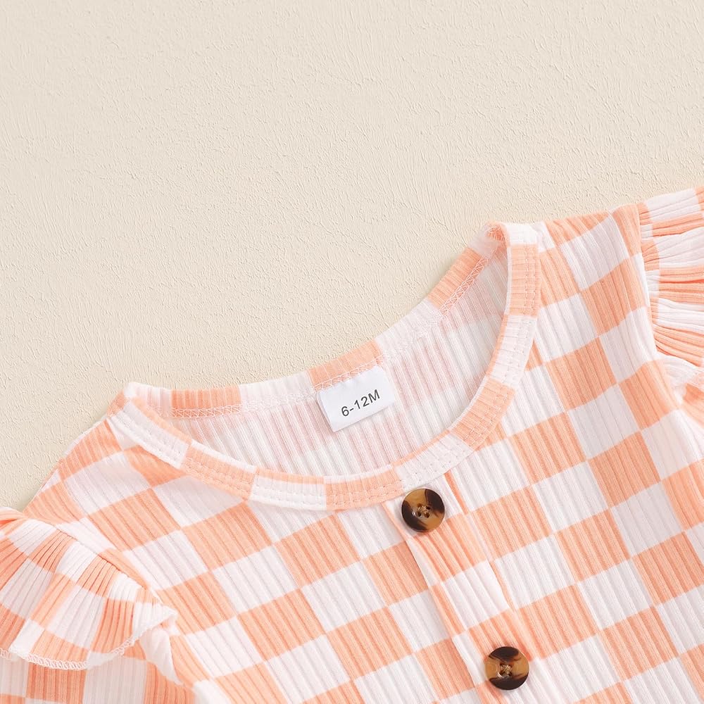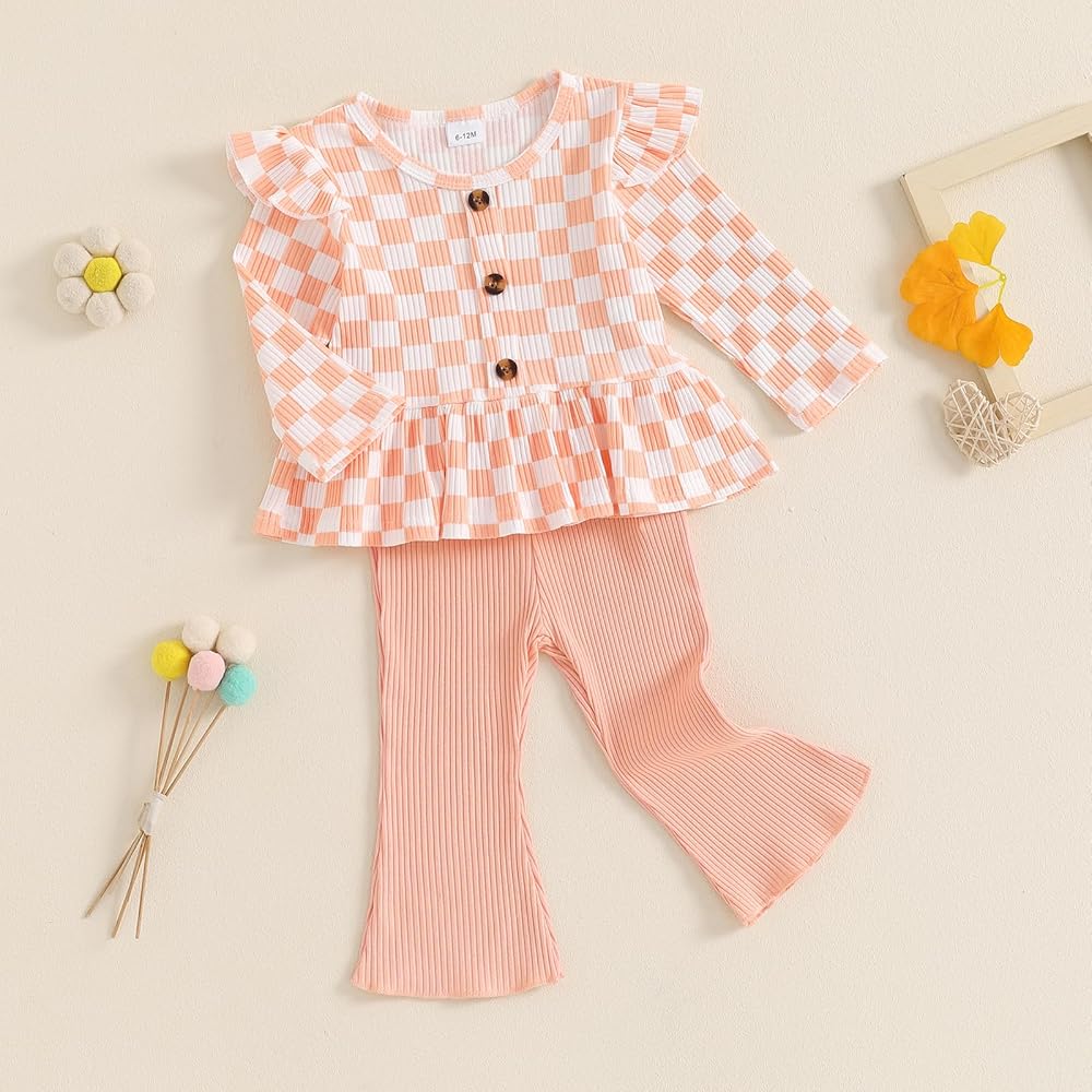 DESIGN---Baby girls' clothing set, toddler girl bell bottom outfits, fall outfits for toddler girls, long sleeve, crew neck, stylish stripes/polka dots/checkerboard print, buttons decor, ruffled hem design, the ribbed knit tops matching with flared pants, with elastic waist, so pretty and fashion! Toddler girls clothes, 2pcs toddler girl pants outfits, the unique design will make your llittle girl look more lovely and she will get a lot of compliments!
