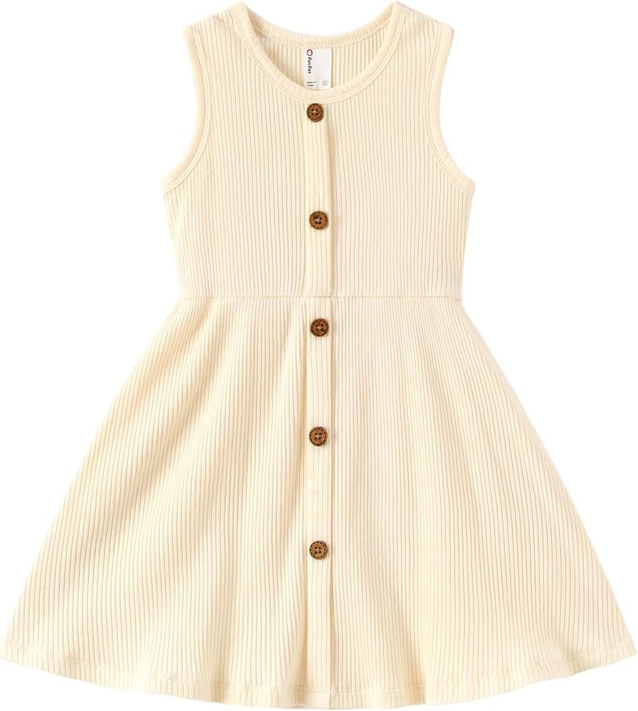 PATPAT charming Toddler Rib Knit Button Front Sleeveless Pinafore Dress with a matching headband – the perfect ensemble for your little one's adorable and stylish look. Crafted with care and attention to detail, this outfit is designed to provide both comfort and undeniable cuteness. Key Features: Rib Knit Elegance: The dress is made from a soft and stretchy rib-knit fabric, ensuring a snug yet gentle fit for your toddler. The ribbed texture adds a touch of sophistication to this playful ensemble. Button Front Detail: The front of the dress features a delightful button-front design enhancing the overall aesthetics. Sleeveless Comfort: Perfect for warmer days, the sleeveless design allows for optimal comfort and freedom of movement, ensuring that your toddler can explore and play with ease. Coordinated Headband: The set includes a matching headband, carefully crafted to complement the dress. The headband adds an extra dose of sweetness to your toddler's look, completing the ensemble with adorable coordination. Versatile Styling: Whether for a casual day out or a special occasion, this pinafore dress and headband set offers versatile styling options. Pair it with a cute blouse or simple outerwear, and your little fashionista is ready to steal the show. Quality Construction: Made with high-quality materials, this ensemble is not only fashionable but also durable. It can withstand the energy and activities of your toddler while maintaining its charm and integrity. Elevate your toddler's wardrobe with our Rib Knit Button Front Sleeveless Pinafore Dress – a delightful outfit that combines style, comfort, and a touch of whimsy. Order now to dress your little one in fashion-forward cuteness!