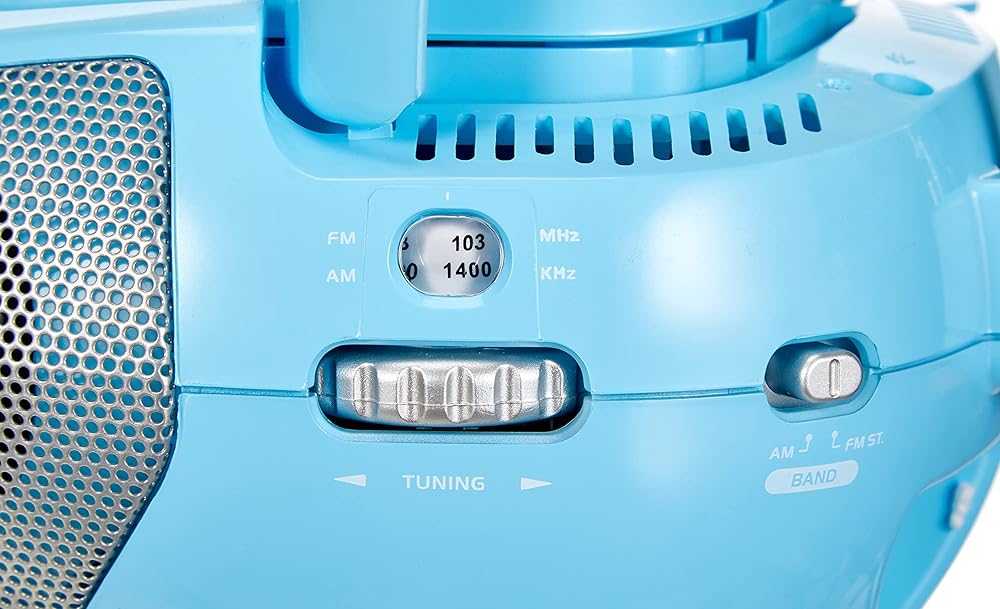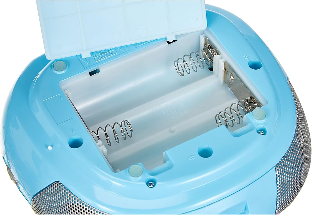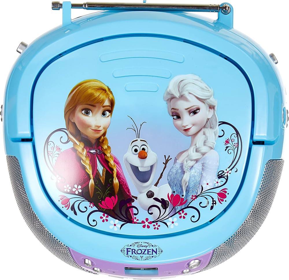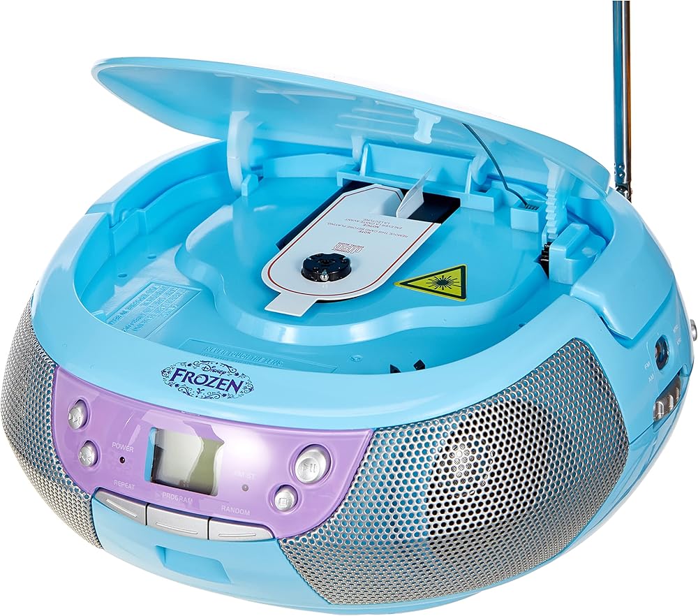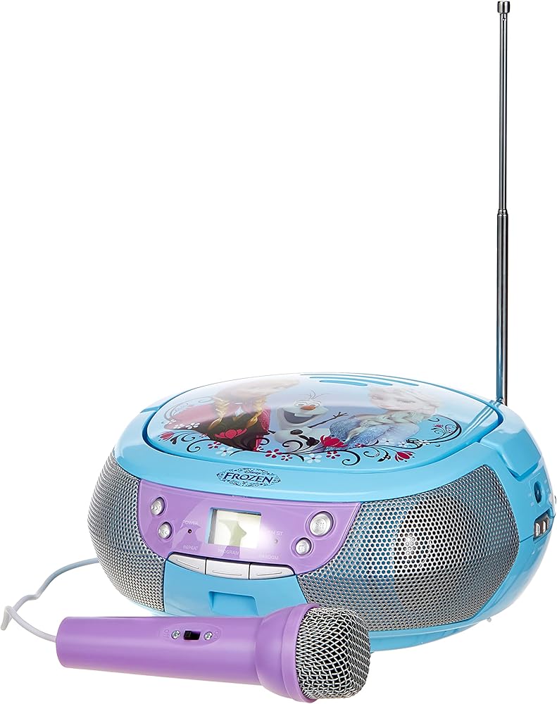 Sing along to your favorite music with your very own Frozen CD Player Boom box with microphone and FM Radio. Play your favorite CD or listen to the FM radio that is included. Includes Aux input to connect your MP3 Player and comes with an adjustable Antenna for the radio reception. Powered by AC Cord (Included) or 6 C Batteries (Not Included) for portability.