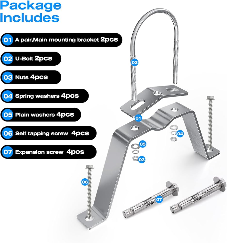 Package Includes:1 pair (3-leg + 3-leg mount braces), including U-Bolt ,V-Block Brackets ,expansion bolts and lag bolts for reliable mount,All are made of 304 stainless steel.