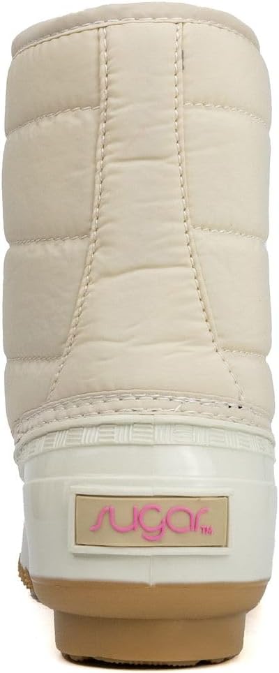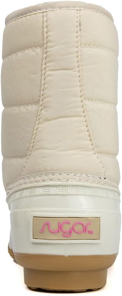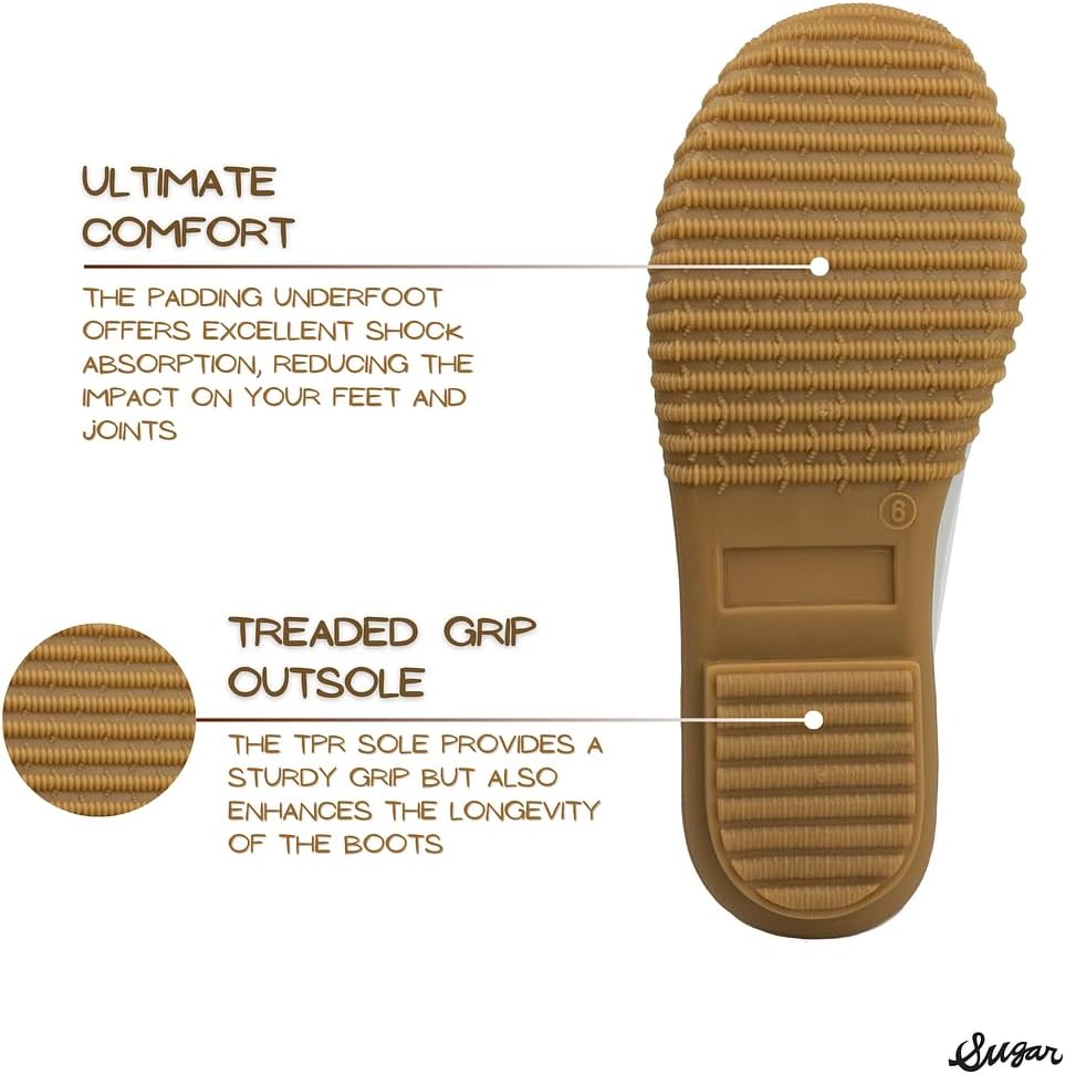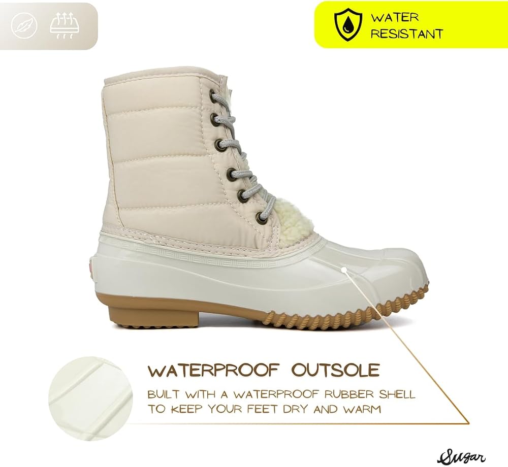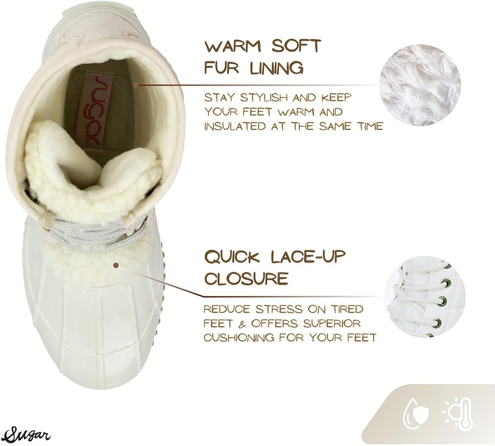 SUGAR Women's Glitter Duck Boots, the epitome of style and functionality. These boots boast a stylish lace-up design paired with a cozy fleece lining for unparalleled comfort in chilly weather. The durable traction sole ensures stability on cold, rainy, or snowy days, making them the perfect choice for any weather condition. Designed with the modern woman in mind, these trendy booties, known as Skipper, feature glitter accents that add a touch of glamour to your ensemble. The medium width ensures a comfortable fit, while the 11.5" circumference and 3.5" shaft height provide a sleek and flattering silhouette. Constructed with quality rubber for durability, these boots are not only fashionable but also reliable. The memory foam insole takes comfort to the next level, making each step a pleasure. Whether you're navigating through rainy streets or strolling in the snow, these SUGAR Glitter Duck Boots are your go-to footwear. Elevate your style and stay comfortable with every step in the Skipper booties. Don't let the weather dictate your fashion choices – embrace the elements in style!