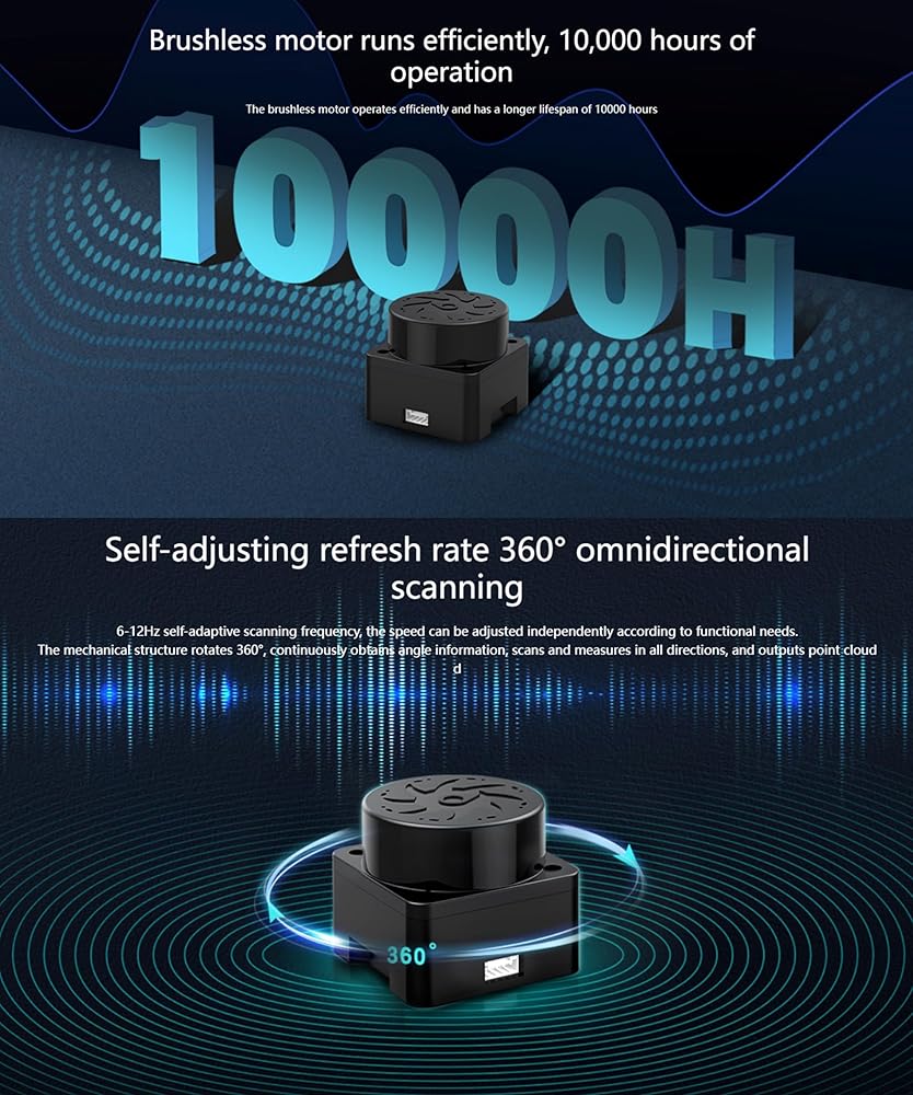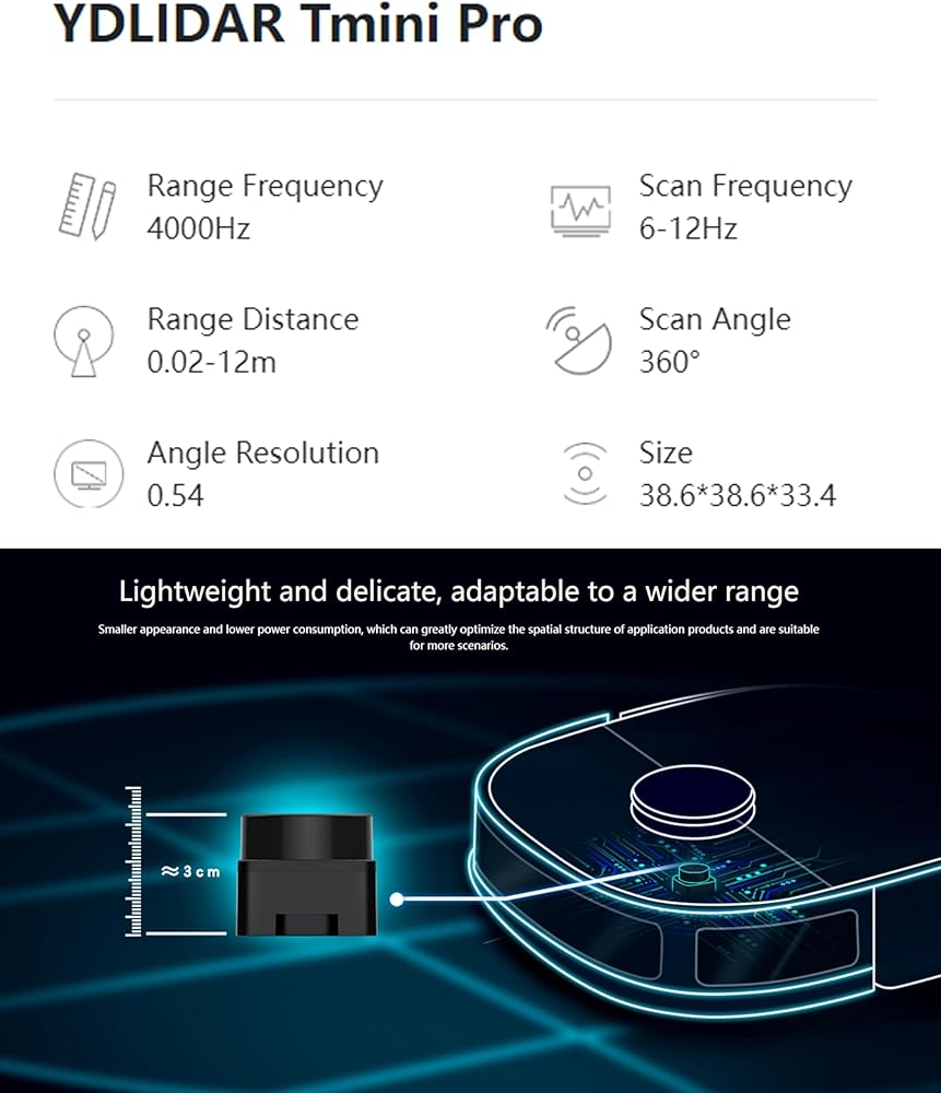 [High Accuracy] Tmini Pro ToF Lidar Scanner Based on the principle of time-of-flight (ToF), 360 degree omnidirectional scanning ranging; Ranging frequency up to 4000Hz ; Range Distance: 0.02~12m; Angular resolution: 0.54°; Scan rate from 6~12Hz.