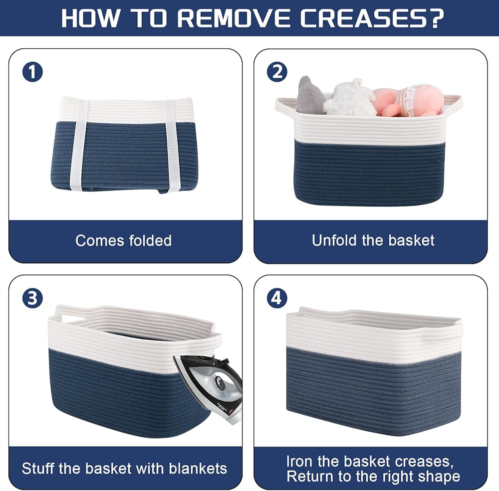 【Note】Decorative storage baskets come as folded, and will have creases. Fully fill the cotton rope basket with towels or clothes waiting for 2-3 days could reshape it. Steaming or Ironing could reshape the storage bins as well.