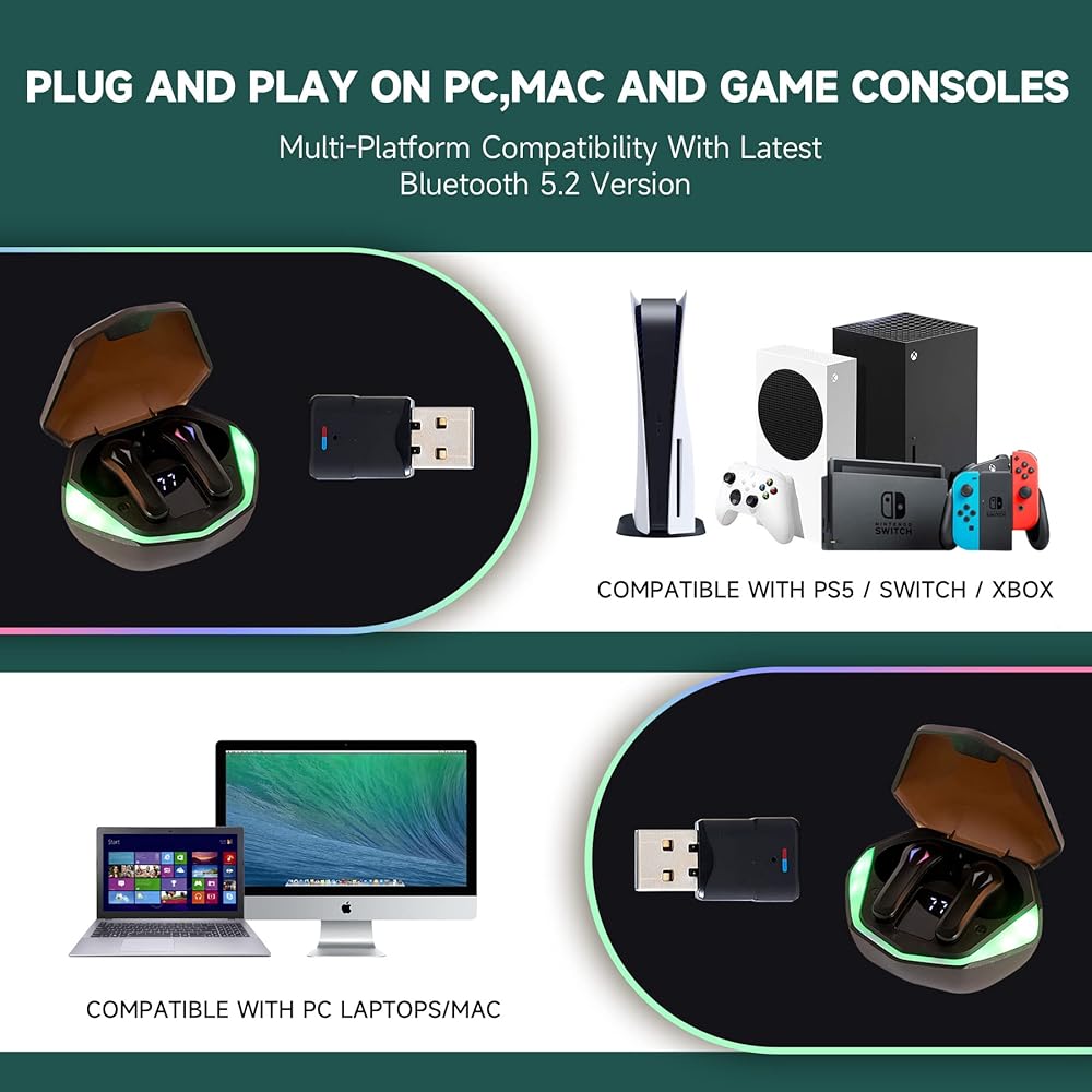 【Plug and Play on PC,PS4,PS5 and Switch】Sontinh AlienBuds are easy to install and use. After first setting up the connection, the headsets will automatically connect via the exclusive USB adapter, and you can use them reliably every day.