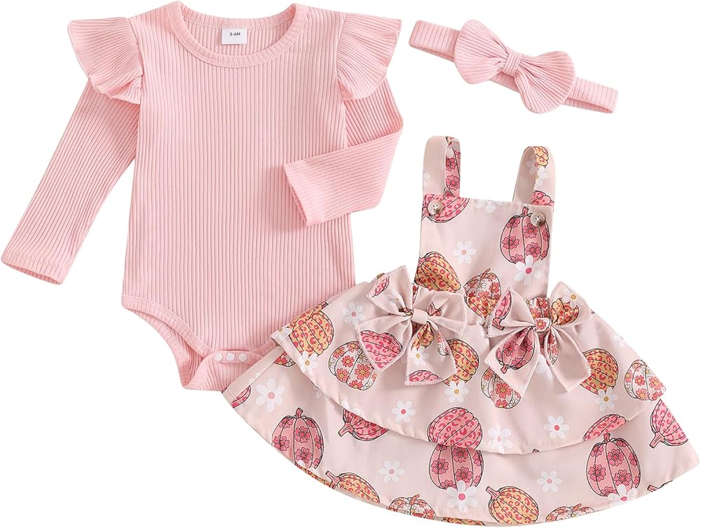 Baby Girls Halloween Outfits Long Sleeve Romper with Bow Suspender Skirt Headband Set Newborn Clothes