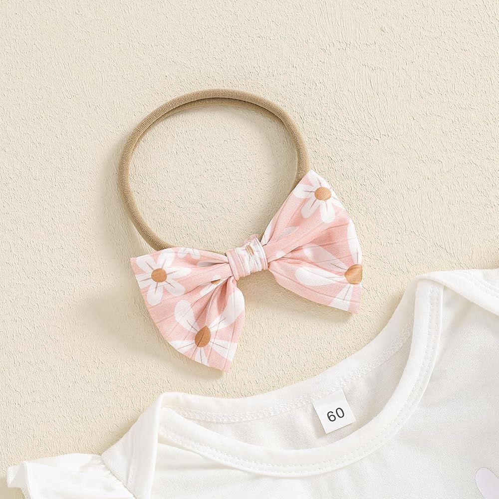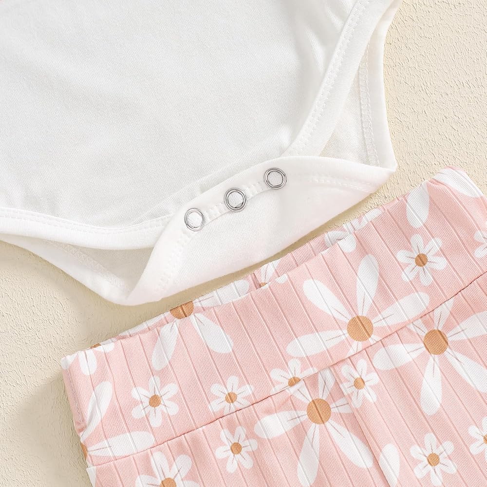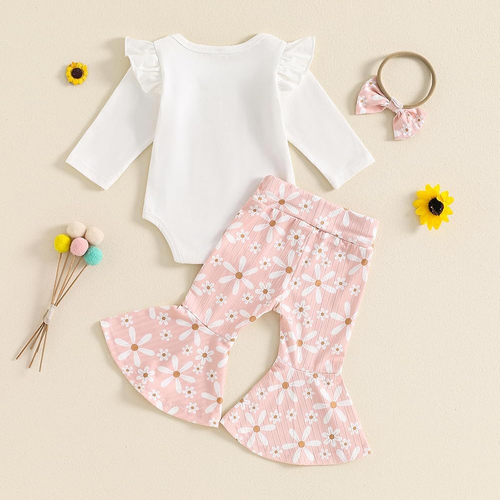 Design: Baby girl fall outfits, baby girl flared pant sets, round neck, long sleeve ribbed ruffle romper, snap closure for you to change diaper, matching with daisy/floral prin elastic waist flared pants and cute headband, baby girl clothing set, cute baby girl daisy outfits, your sweet baby girl will get a lot of compliments in it!