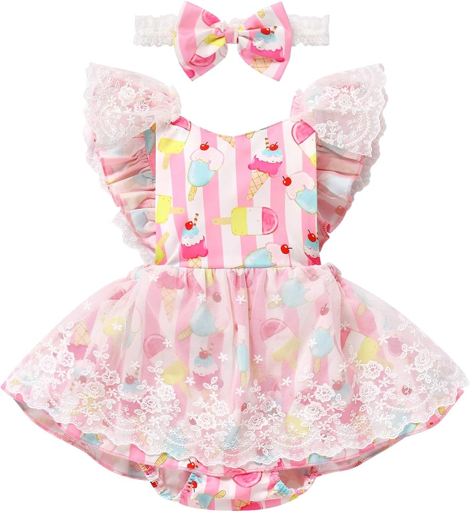 Infants Toddlers Baby Girls Flutter Sleeve Butterfly/ Floral Ruffle Tulle Romper Dress and Headband