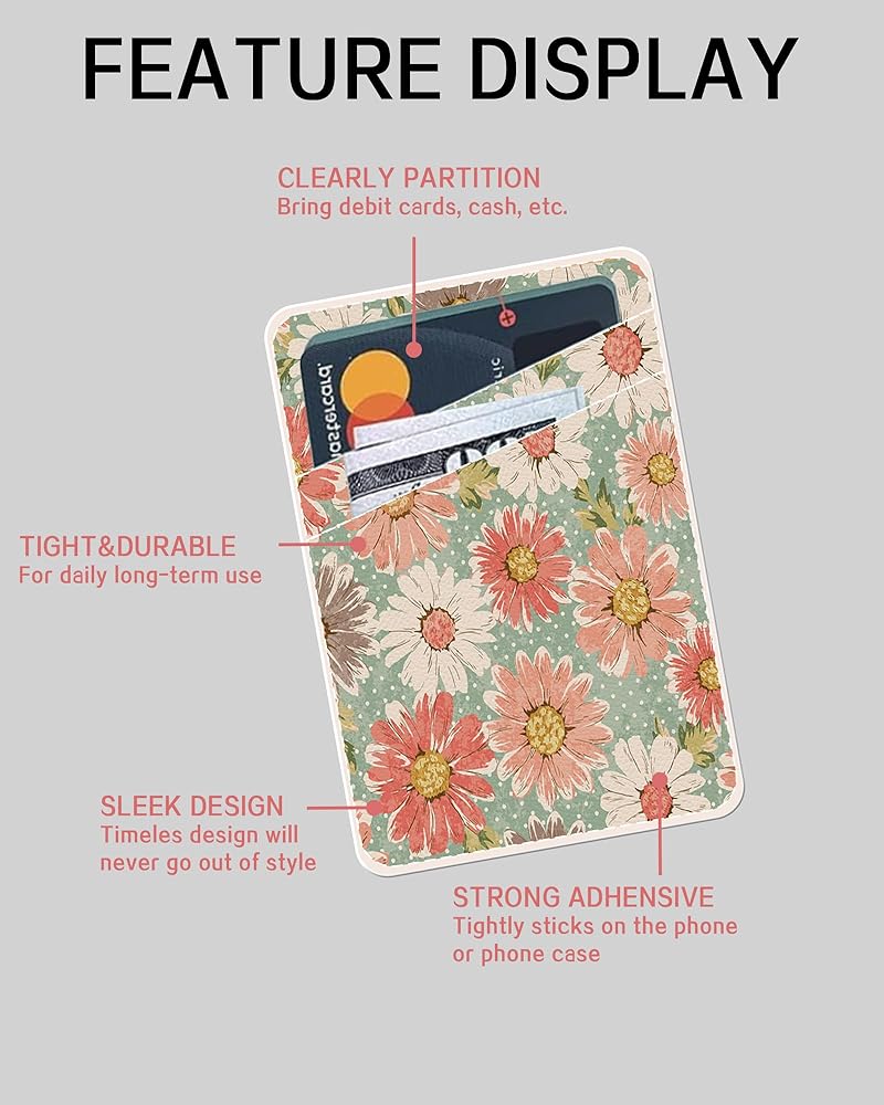 Phone Card Holder Leather, Dual Pocket Phone Wallet Adhesive Stick On, Cute Phone Case Credit Card Holder, Suitable for Most of Phones Retro Boho Flowers