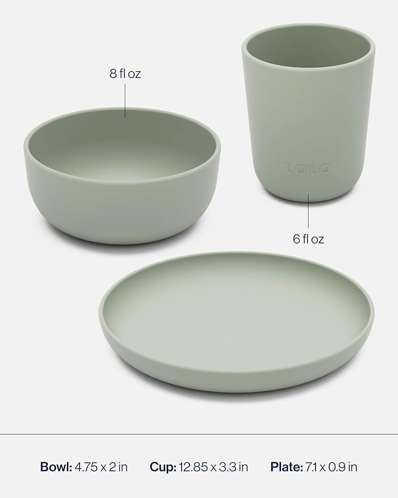 QUALITY MATERIAL: Lalo mealtime set is safe for your family! The bowl, plate, and 4oz cup are made from BPA free silicone. The utensils have stainless steel components, made for little hands.