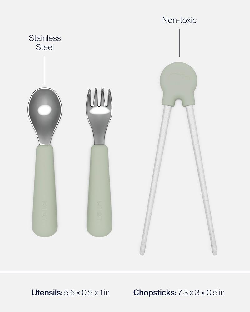 Lalo Big Bites Kids Dinnerware Full Set - Dishwasher Safe, BPA Free, Kids Tableware Set - Includes Stackable Bowl, Plate, Utensils & Cup - 7 Pieces - Sage