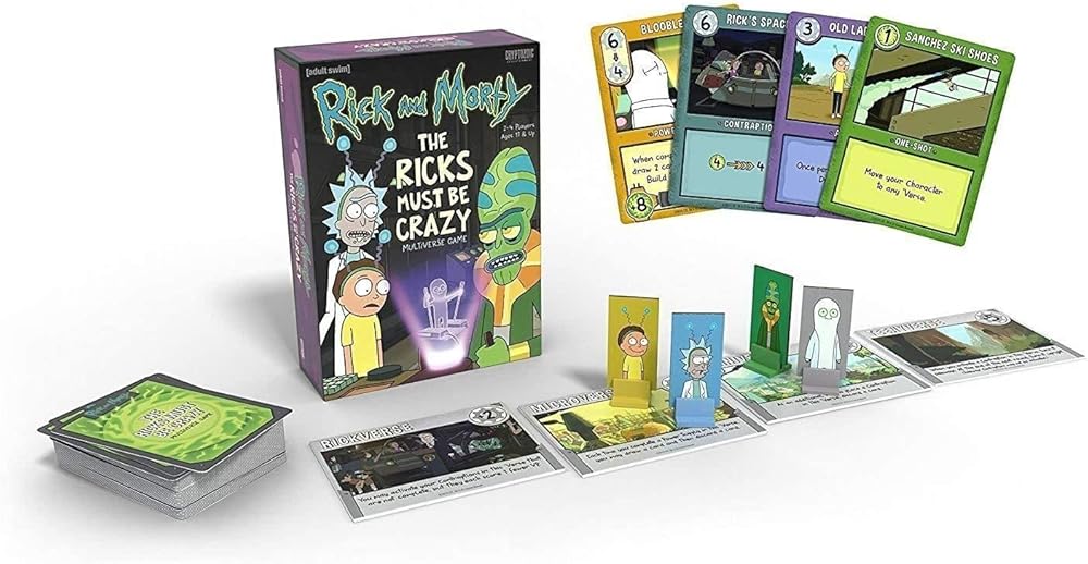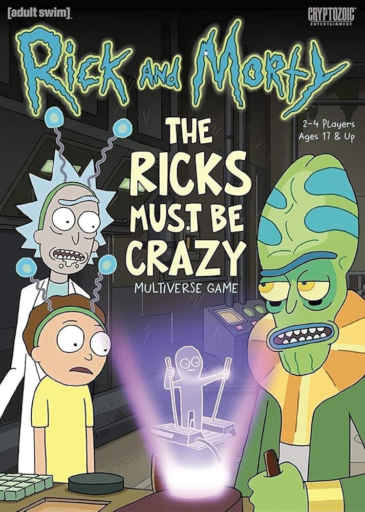 Take on the roles of Rick, Morty, Zeep, and Kyle and introduce wondrous Power-making technology to the worlds you've created. and then steal most of it for yourself. That is, if your opponents don't get to it first! This is an engine-building game (of sorts) that takes place in the four locations ("`Verses," we call them) from the popular episode "The Ricks Must Be Crazy": the Rick verse, Microverse, Miniverse, and Teenyverse. Due to time dilation and other pseudo-scientific malarkey, the lower you travel in the `Verses, the greater number of Actions you'll have each round. But some of those lower `Verses are a bit primitive, so the Contraptions you build to use all that sweet Power might not work so well! During your turn, you'll spend your Actions to build Power Supplies and Contraptions and even move to a new `Verse to take advantage of some excess Power there. At the end of each round, the Power generates from the bottom 'Verse up, and players can use that Power as it travels from `Verse to `Verse to play One-Shot abilities, use Character Abilities, and power-up their Contraptions. Player order matters in each `Verse, so hopefully your opponents left you some Power to use!.