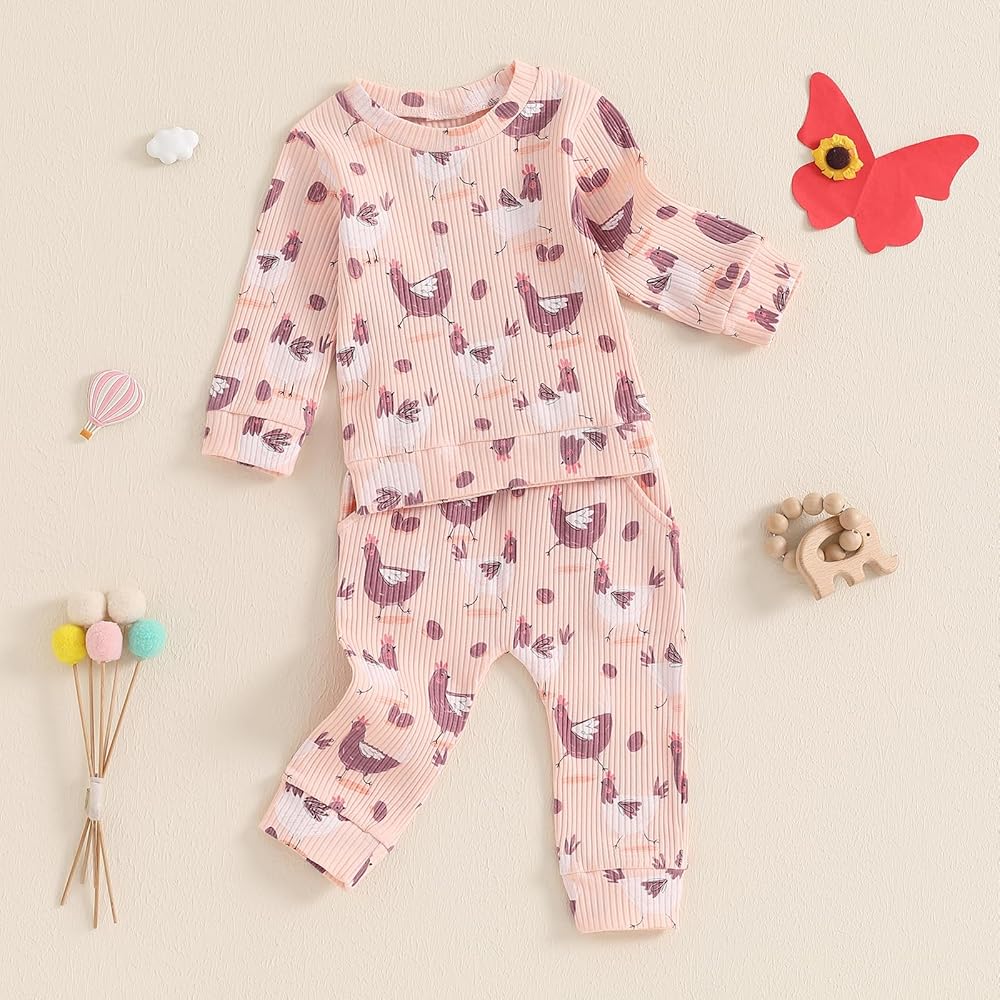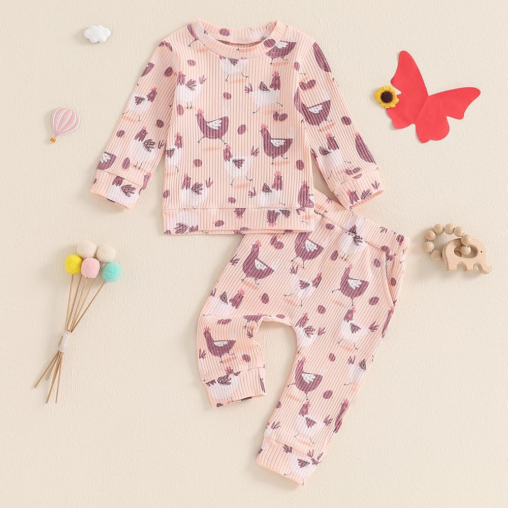 🐉🦋🐓2024 DESIGN: The fall baby girl clothes, toddler girl sweatshirt has long sleeve, crewneck, Dinosaur/Butterfly/Chicken printed pullover sweatshirt tops matching with elastic waist jogger Pants. This baby girl spring fall winter outfit is fashionable and lovely. Newborn baby girl fall clothes, butterfly baby outfits, baby girl farm outfit, dinosaur baby girl clothes, baby girl two piece matching sets.