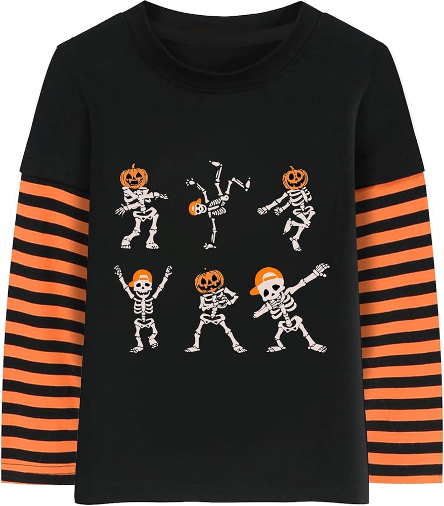 Premium Quality Material: Our toddler Halloween shirt are made from 100% cotton fabric, ensuring superior comfort and durability. The round neck design makes it easy to put on and take off. The orange and black striped patchwork sleeves add a trendy touch to this halloween shirts for kids.