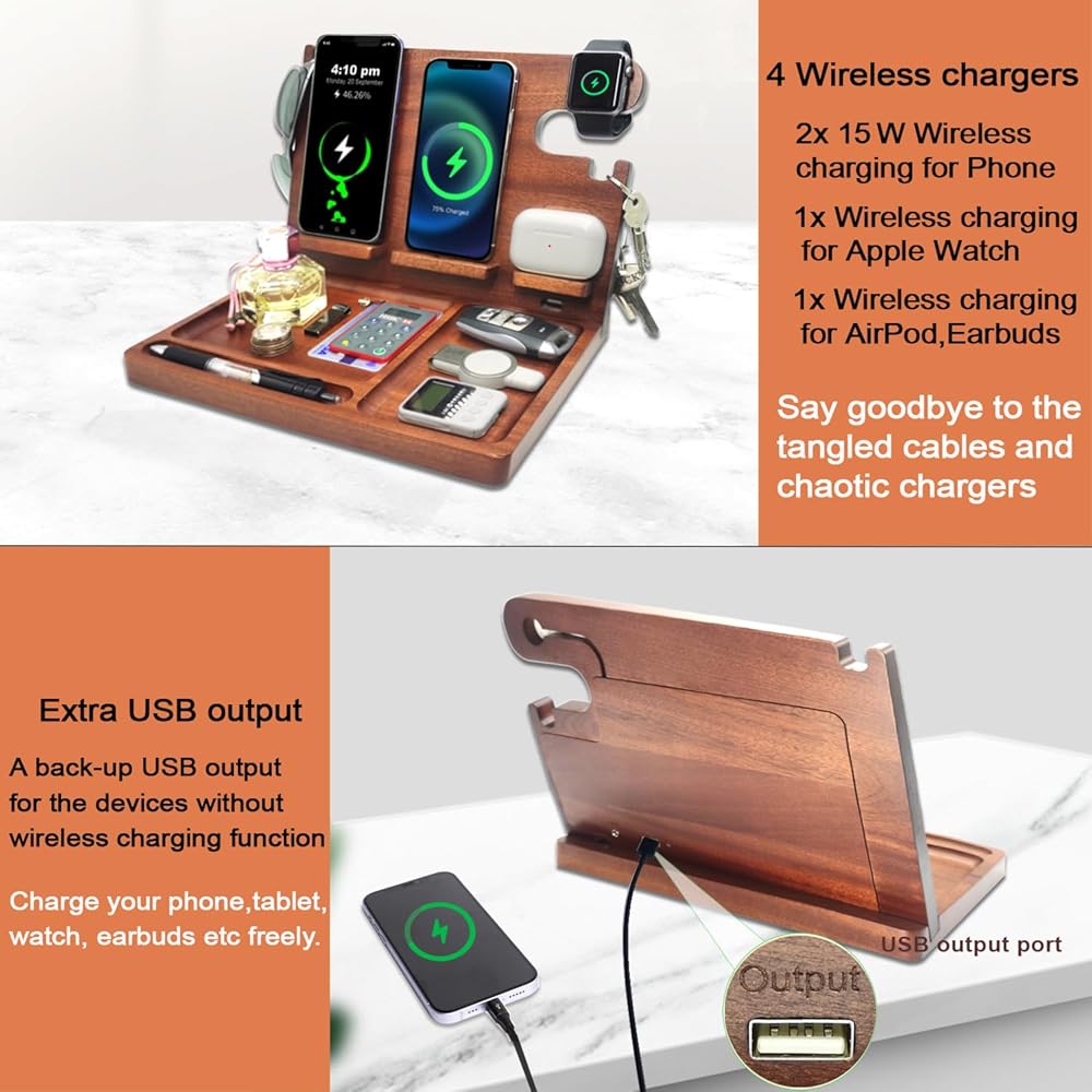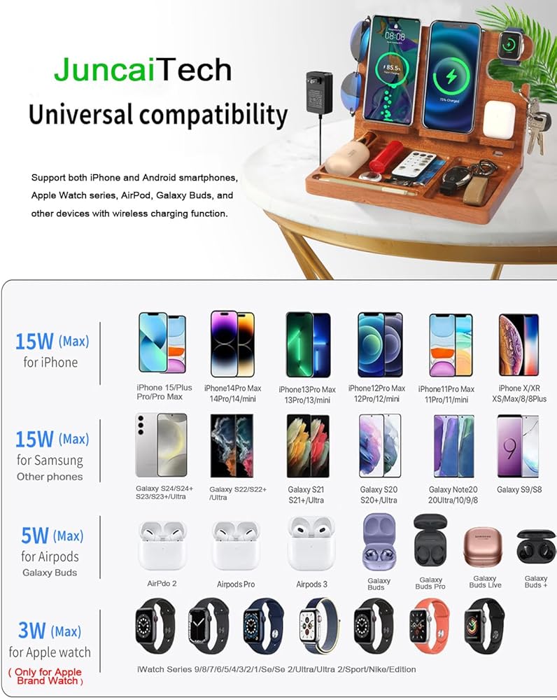 【3 in 1 Wireless Charging Station】This wood charging station for multiple devices charge up to two phones,one AirPods,and one Apple Watch simultaneously with the built-in wireless charging capabilities. Say goodbye to messy cables on your desk through JuncaiTech cargador inalámbrico para iphone. For devices that do not support wireless charging, a backup USB port is available to ensure your Phone and watch stay powered up.