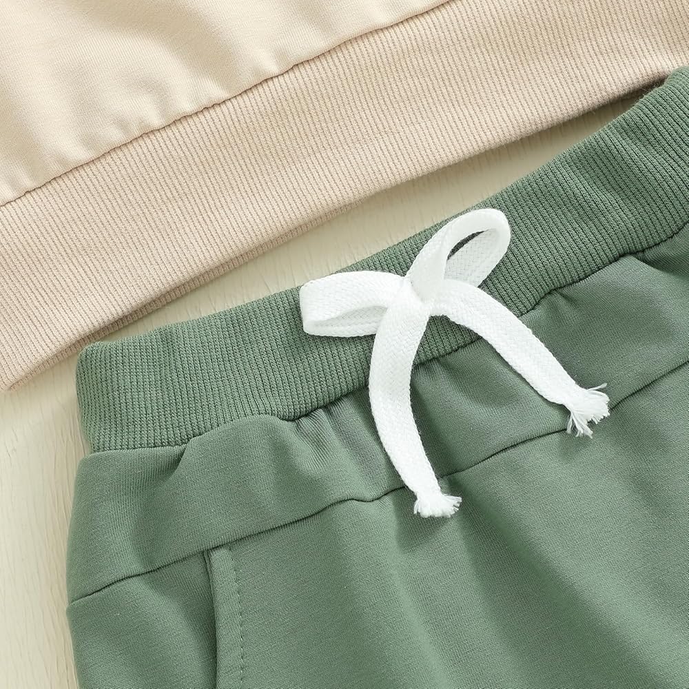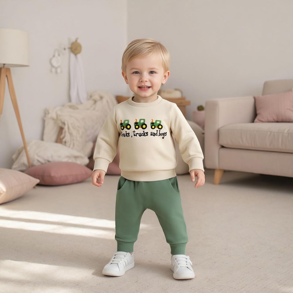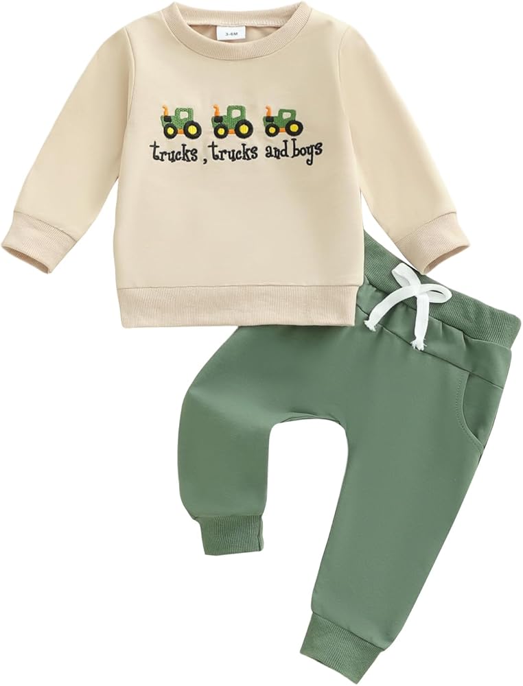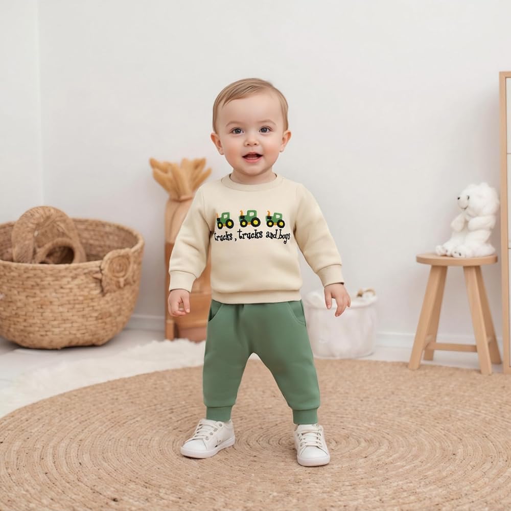 Design: Baby boy farm clothes,round neck sweatshirts, matching with elastic waist long pants, bright colors make the baby look cute and lovely. Baby boy tractor print long sleeve sweatshirt pullover with chest pocket, elastic waistband pants with side pockets