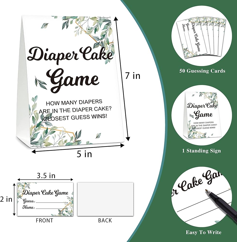 1)Each pack including: 1 self-standing double sided sign, 50 guessing cards, which could meet enough guests party requirement with only one pack of our game card set. 2)The size of the standing sign is 5"x7", double-sided design; the size of the guessing card is 2.1"x3.5", easy to carry and write. 3)The standing sign is made of 300 grams coated paper, thick and hard enough to self-stand no frame needed, which can stand independently. Besides, we use advanced printing technology to print rich and bright colors on high-quality cardboard. 4)All guessing cards are made from a thick and heavy-duty paper, which is much more elegant and easy for writing with many pen types. Single-sided printing in rich, beautiful colors. Each of the note cards are blank on the back and leaves plenty of space for expressing your diaper thoughts. 5)This Baby Shower Game is a fun activity for all types of guests at a baby shower, which also can be done with your family and friends by having them guess and fill out the cards with a full of joy and excitement!