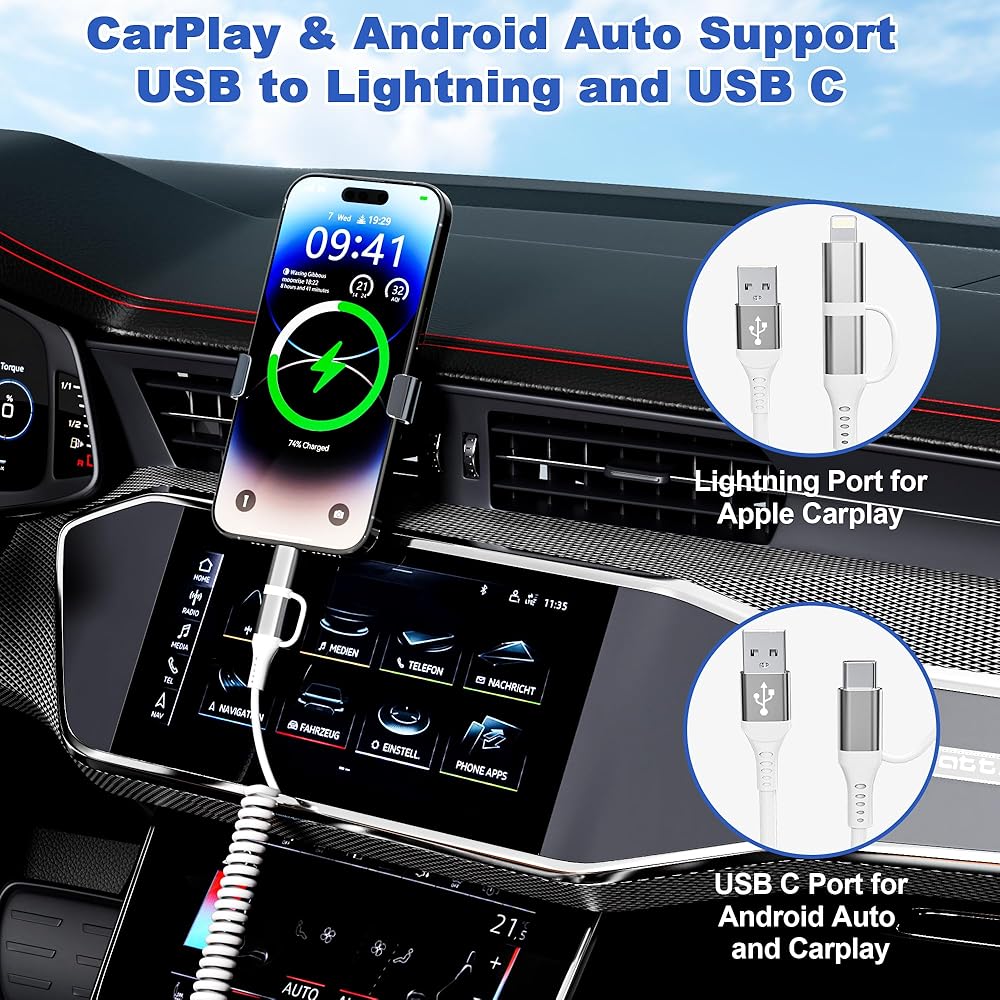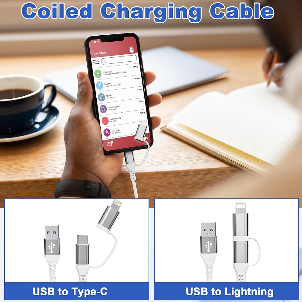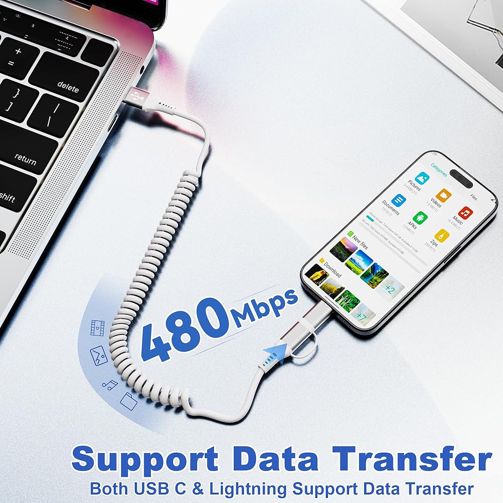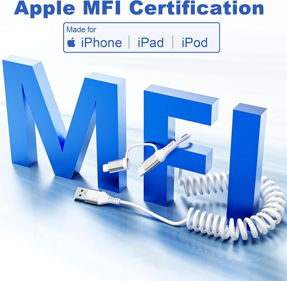 USB to USB-C and Lightning Cable Combo 2 in 1 Coiled Cable Apple Carplay & Android Auto Support [MFi & Fast Charge & Data Sync] Coiled Lightning and USB C Cable for iPhone 16/15/14/13/Android