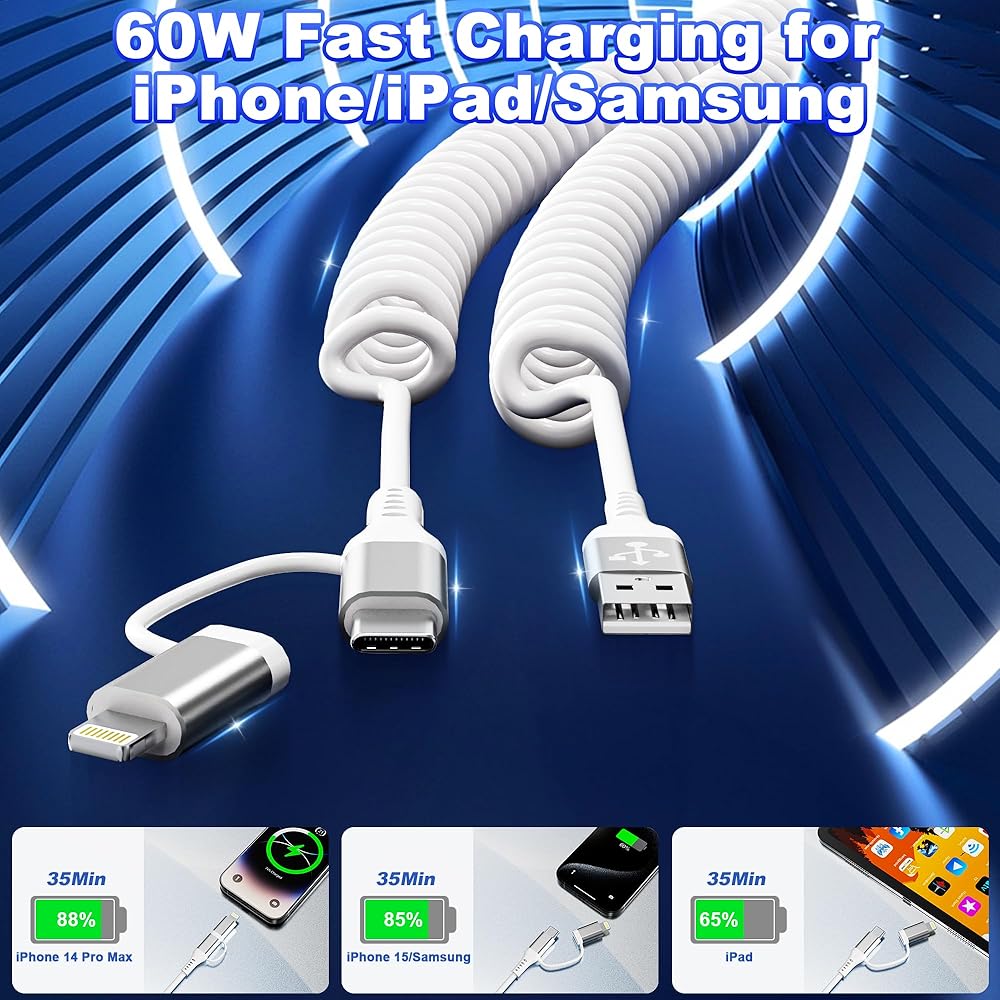【4 IN 1 Pink Coiled Multi Charging Cable】4 IN 1 coiled usb c lightning cable fit a variety of devices, supporting USB A to USB C, USB A to Lightning, USB C to USB C and USB C to Lightning. The iPhone usb cable use retractable design, help you keep the car or jeep console neat, without hassle of long data cord clutter and tangles, perfect for use in the car