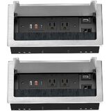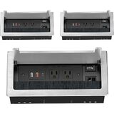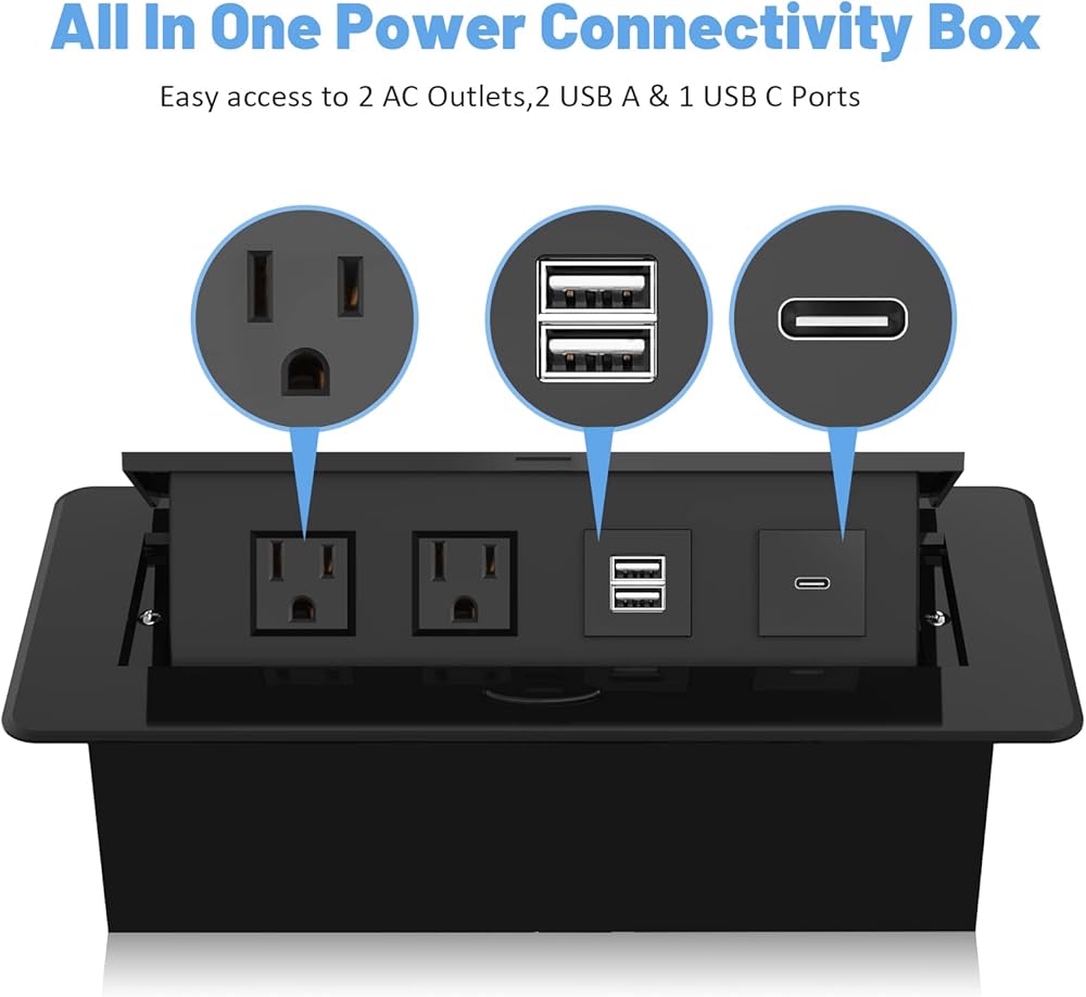 7 in 1 Multimedia Connectivity Box: Conference table power hub with HDMI and Network port , 3 USB ports, 2 AC outlets. This hidden outlet help organize messy wires, allows you to utilize all of the desk space when the outlets are not in use; making your desktop clean and tidy.