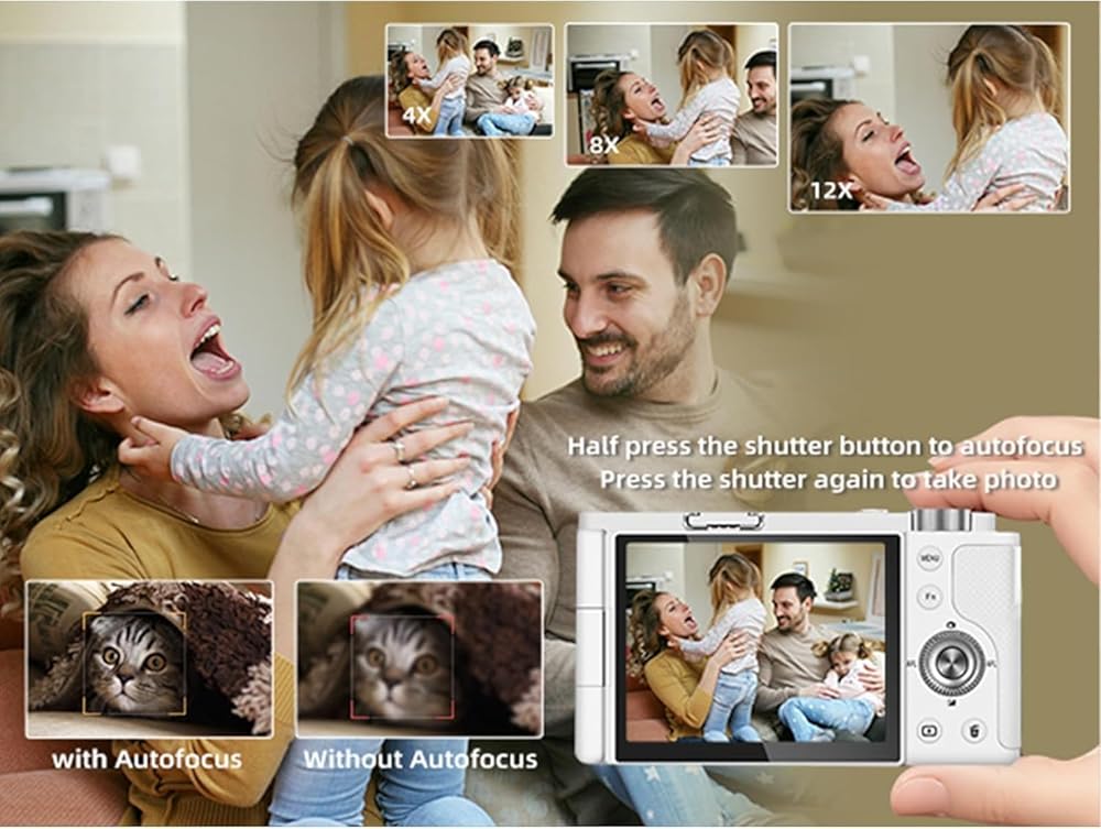 【Main Features】8.0MP SONY CMOS IMX415 Sensor - f/1.8-f/2.6 Lens - UHD 5K30p Video Recording and 64MP Photo - 3.2" Side Flip-Out Touchscreen LCD - 12X Optical Zoom, Auto focus and Manual foucs mode & Face Priority AE - Slow Motion &Time-lapse video- Wifi APP Easy Smartphone Connection, Micro shooting,