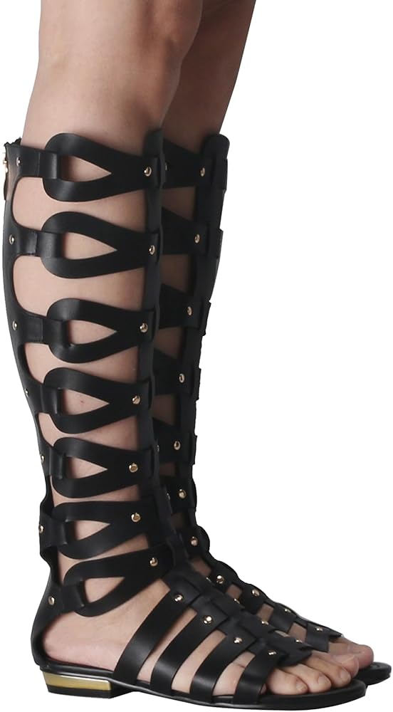 This strappy flat knee high outdoors gladiator sandals are metal color faux leather materials with dense rivets studded, It is very cool and eye-catching.