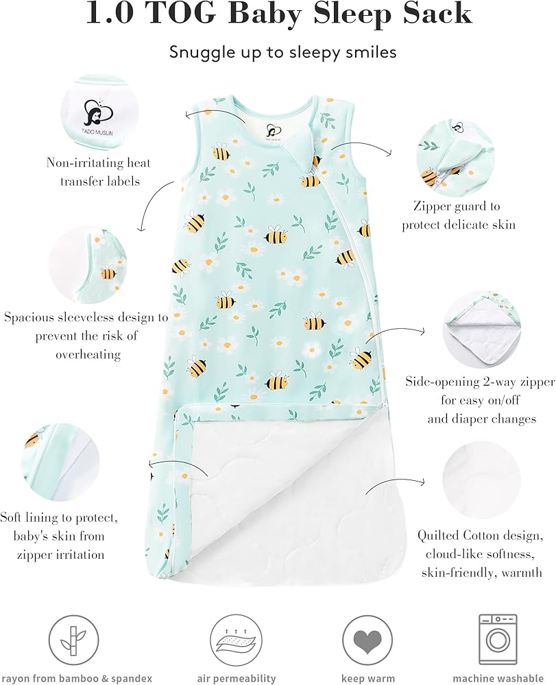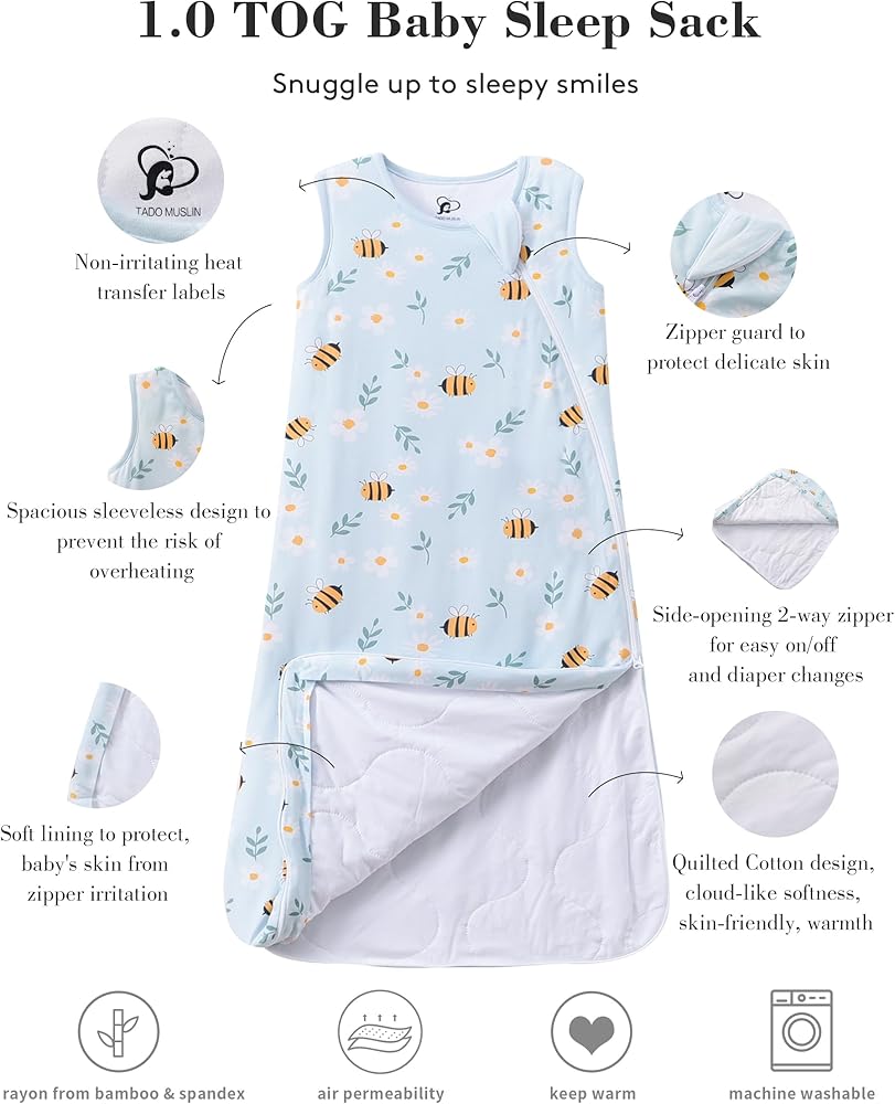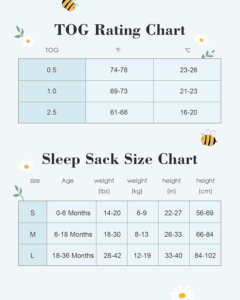 Year-Round Slumber Solution: Say goodbye to seasonal sleep worries! With its clever 1 TOG rating, our sleep sack is your all-weather ally. It's like a thermostat for your baby, keeping them "just right" no matter the season. The breathable fabric works overtime, whisking away sweat on warm nights and cozying up on chilly mornings. It's your ticket to peaceful nights and happy naps, 365 days a year!