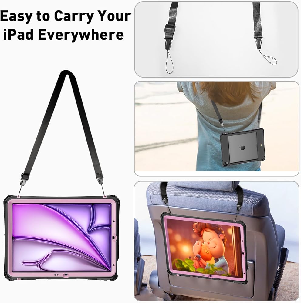 【Adjustable Shoulder Strap + Hand Strap】Transy for iPad Air 11-inch 6th Gen case featuring a shoulder strap, designed to free up hands and provide convenient outdoor carrying without the worry of accidental drops. Also features a hand strap that supports horizontal and vertical, ensuring a secure grip on the ipad during use to prevent accidental slips from hands. Stay connected and protected wherever you go with this versatile case designed for active lifestyles.
