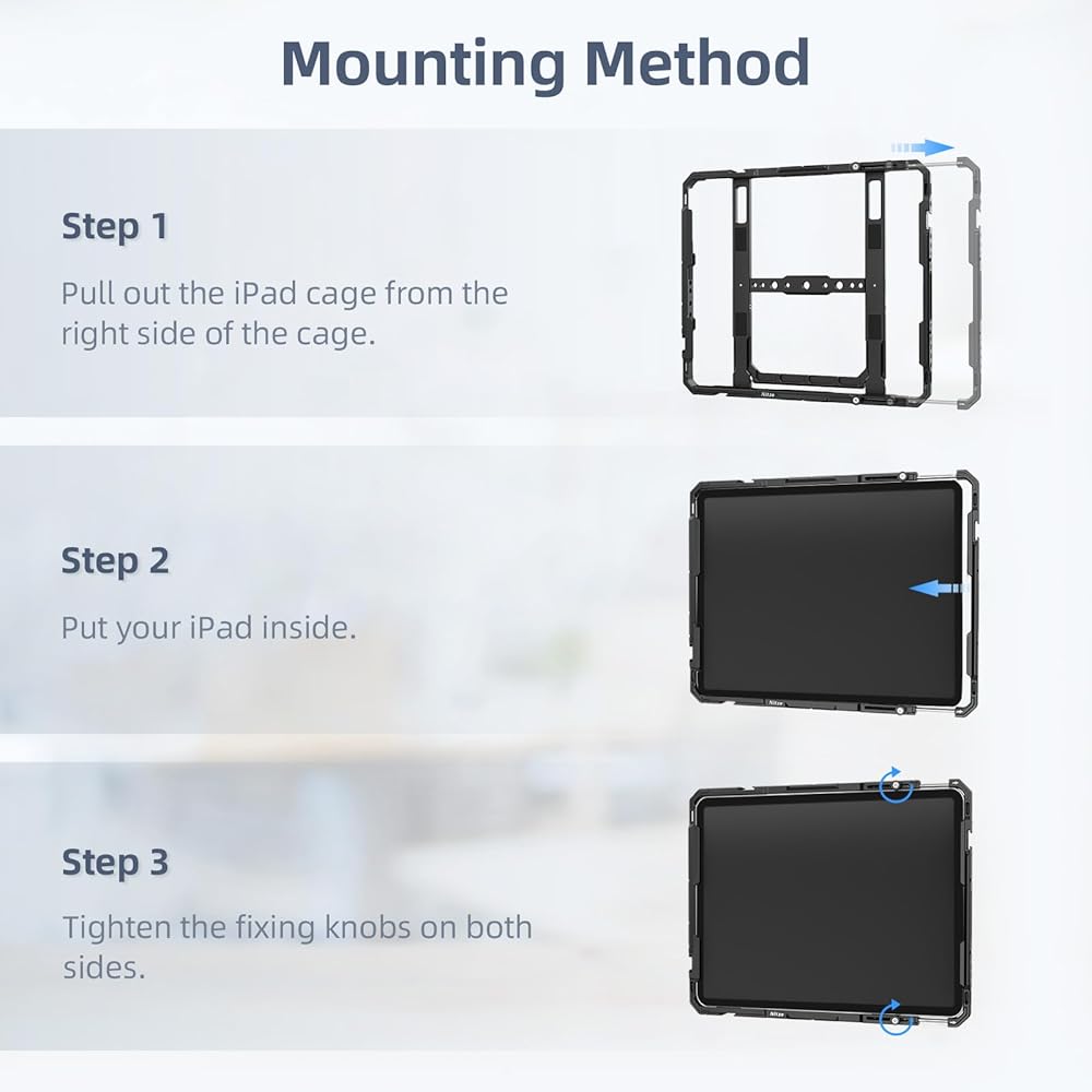 Mounting Method: 1. Pull out the iPad cage from the right side of the cage; 2. Put your iPad inside; 3. Tighten the fixing knobs to lock your iPad completely; *The length of the iPad cage can be adjusted from 260 to 290 mm to fit different size tablets.