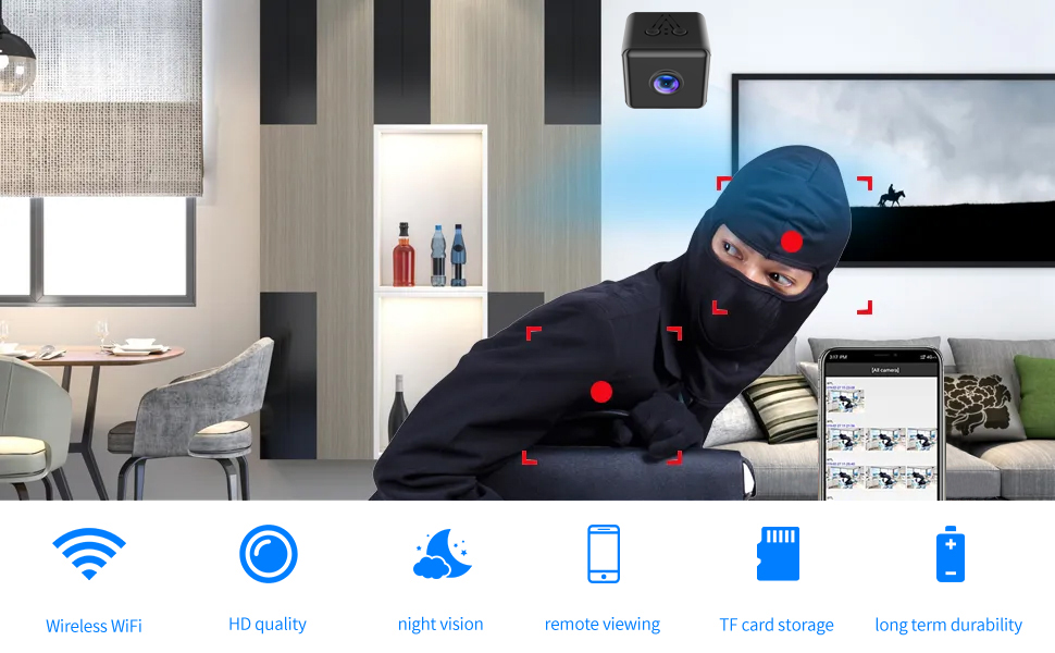 【Latest Smart Camera】:latest design mini portable camera for indoor/outdoor to produce 1080P ultra-high-definition live footage. It's smallest wifi camera. Once your iPhone or Android phone configured with router Wi-Fi. Then you can view live video on the App remotely from anywhere in the world. Protect your family and your home investment from would-be burglars with security camera.