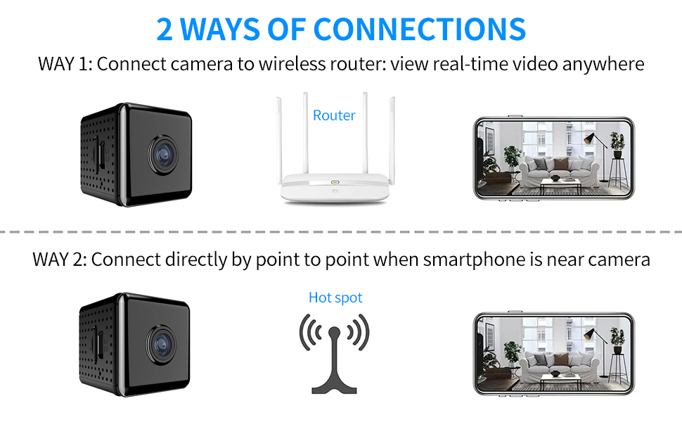 【Ultra Small Wireless Camera】: This small camera is portable, which makes it perfect for use as a wireless home security camera or housekeeper/nanny cam/baby monitor with a camera to record snapshot pictures and videos without drawing any attention. In addition, it can be used as a car camera, dog/pet camera, baby monitor or air action camera.