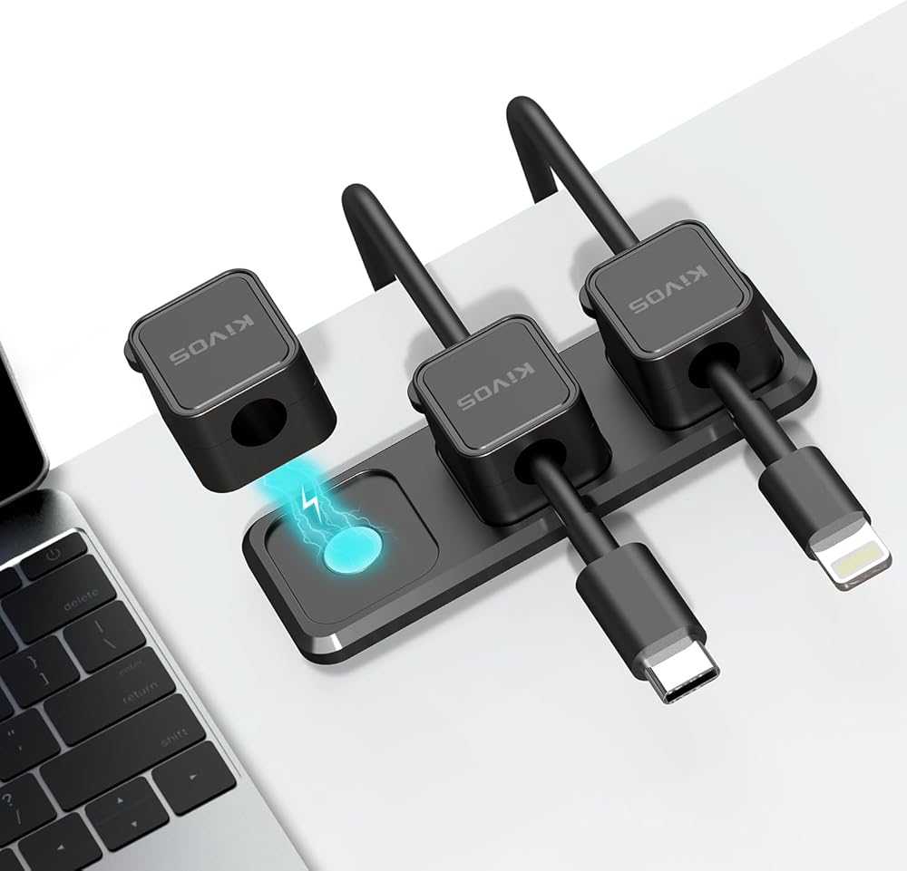 【Versatile Mounting Options】The KIVOS cable clips feature built-in magnets for direct attachment to metal surfaces, as well as residue-free adhesive pads for secure placement on various materials like wood, glass, and tiles, providing versatile usage scenarios.