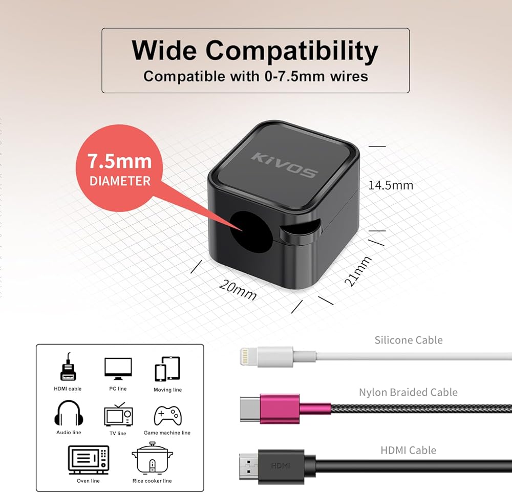 【Perfect Cable Slot Diameter】With a slot diameter of 7.5mm, these cable clips securely hold most cables, such as phone charging cords, USB cables, HDMI cables, and computer power cords. They can also perfectly fit smaller charging heads like the original iPhone silicone cable without falling off.