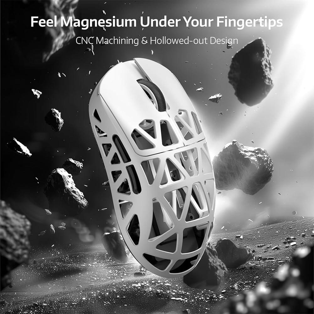 • 【Magnesium alloy ultra lightweight 45g design】The R2 shell is made of low-density and high-strength magnesium alloy material, processed through CNC-integrated metallic frame design. The hollow design not only gives the mouse a unique appearance, but also makes it thinner and lighter. Combining relentless durability with lightweight and agility, ensuring you to maintain your grip cool and responsive during intense gaming sessions. Perfect for all RPG, FPS, MMO, MOBA, Battle Royale and other fast-paced games.
