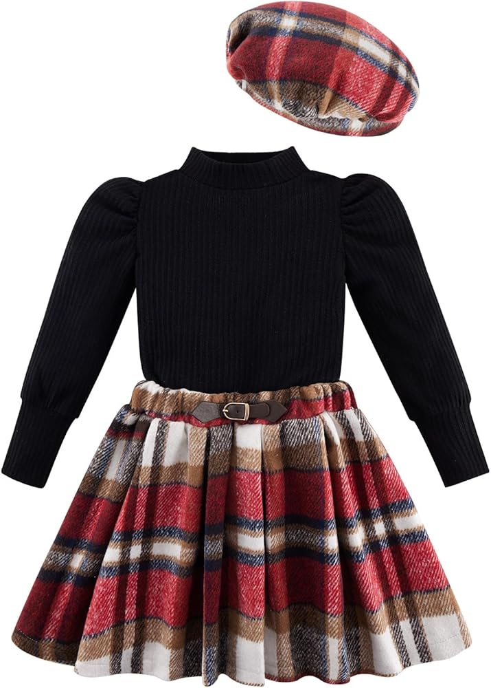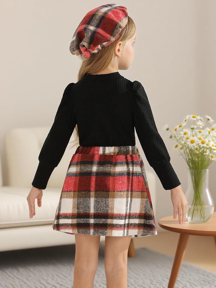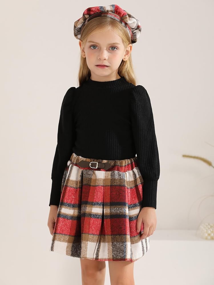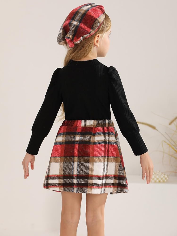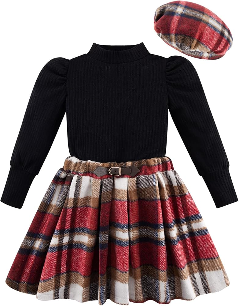 COLORS: Our solid toddler long sleeve shirt comes in four colors, khaki, beige, pink, black shirt for girls with different color plaid mini skirt and hat.Our plaid skirt for girls is designed to contrast with the solid color of the top, adding layers to the overall look.