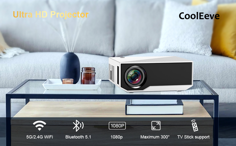 【Portable Mobile Home Cinema】CoolEeve projector provides a minimal display area of 35” to a maximum 300” image. It enables excellent playback of movies, TV shows, video games and can be set up conveniently. Our newly improved 2024 uniform illumination method provides the optimal visual experience, ensuring no dark areas are present along the edges of the displayed image
