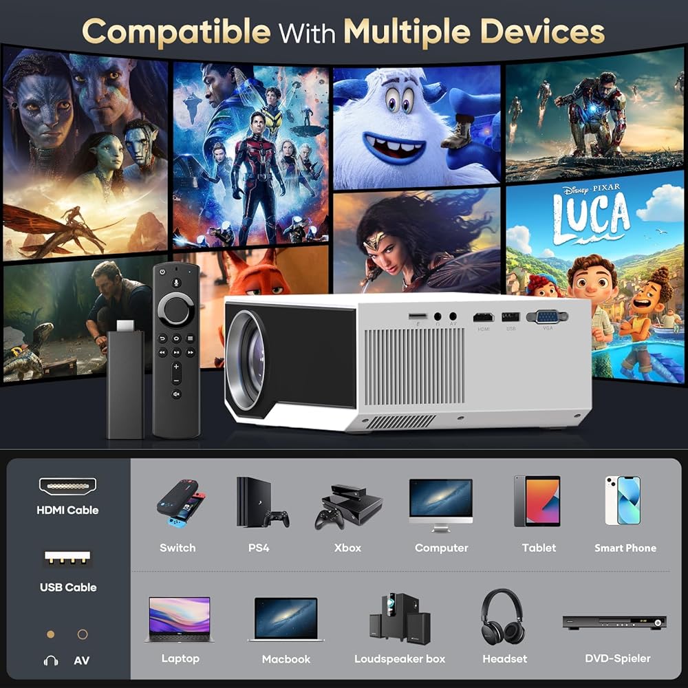 【Extensive Connection Compatibility】With the built-in HDMI, VGA, AV, USB, AUX, MicroSD, plus included AV & HDMI cables, this portable projector is the perfect solution for a wide variety of input sources including but not limited to TV Stick/Box, Game Consoles, PCs, Smartphones, Tablets, Laptops, DVD players, TF cards and USB flash drives. We provide multimedia compatibility