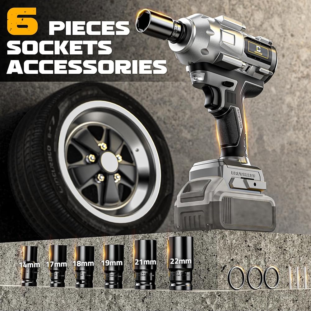 [900FT-LBS HIGH TORQUE] - Cordless Impact Wrench has a maximum tightening torque of 900ft-lbs. Easily tighten and loosen screws in seconds with our Impact Gun, Ideal for automotive repairs, construction projects, and heavy-duty industrial tasks.Comprehensive Tool Set with 6 Sockets and Durable Toolbox for Versatile Use.
