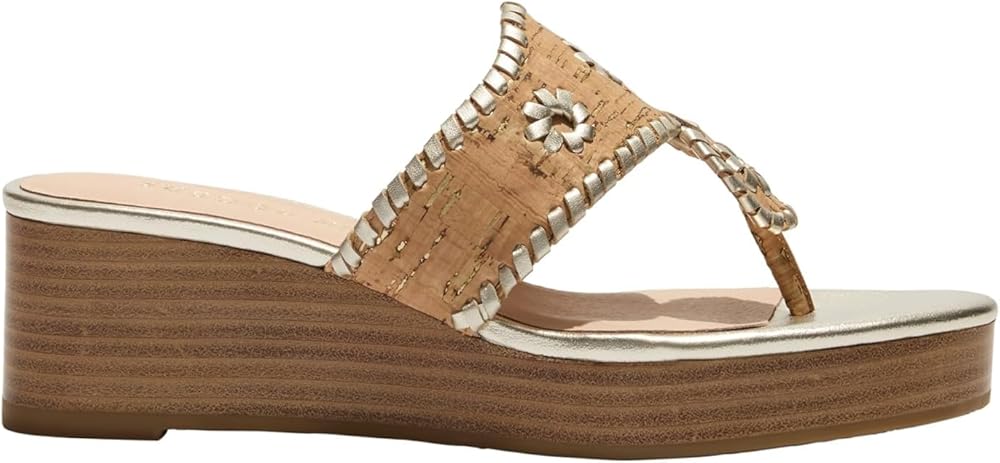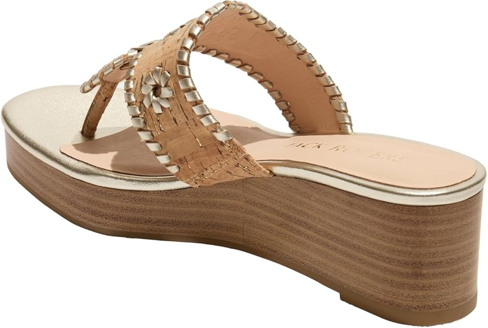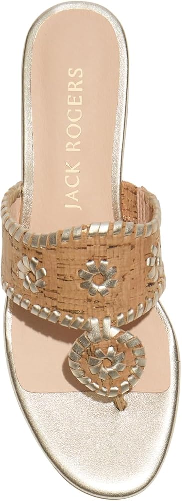 The iconic Jacks you know and love, with a little lift on a 50mm stacked wedge. With our signature whipstitch and iconic rondelles, the sandal that never goes out of style with a playful mid wedge, that has become a best seller. These season it is available in some of best selling materials, cork, metallics and nappa leather.