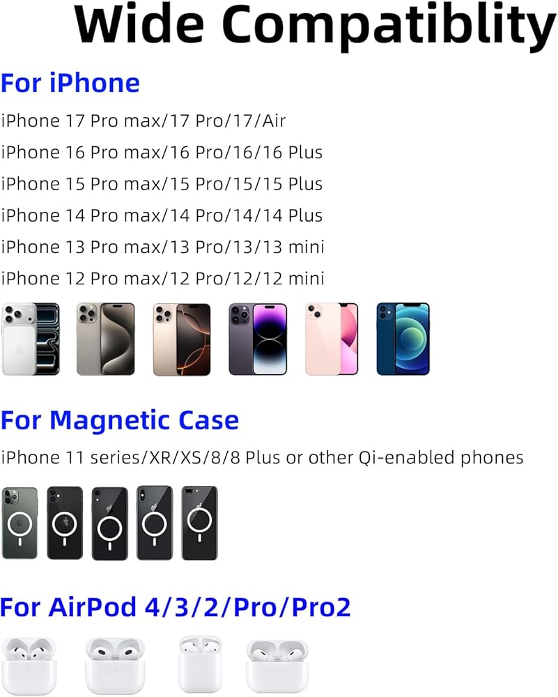 【Designed for iPhone 15/14/13/12 Series】Our magnetic wireless charger is with the latest system, easy to connect and more convenient for wireless charging. Especially suitable for iPhone 14/15,14/15 Pro,14/15 Pro Max,14/15 Plus; iPhone 13, 13 Pro,13 Pro Max,13 Mini;iPhone 12, 12 Pro, 12 Pro Max, 12 Mini, and AirPods Pro 3 2. above models with Mag-Safe case also supports magnetic charging.