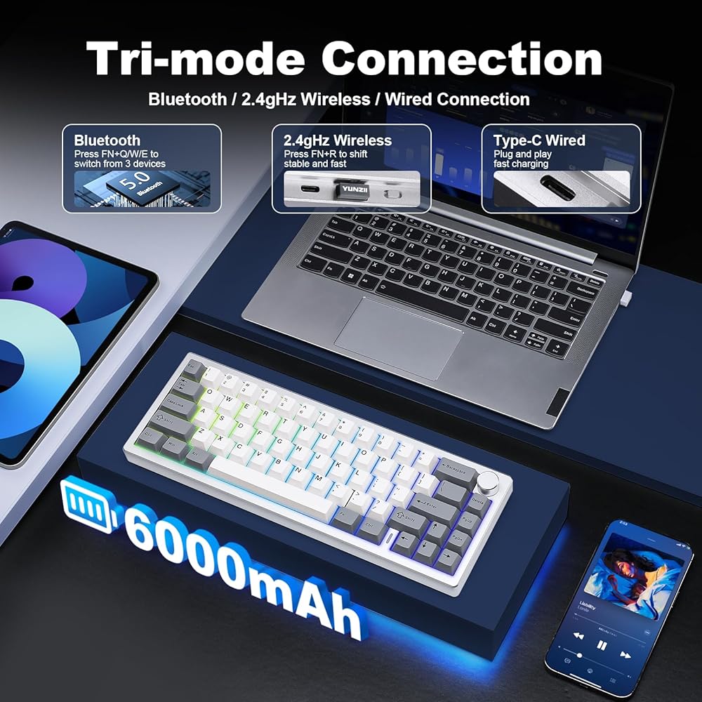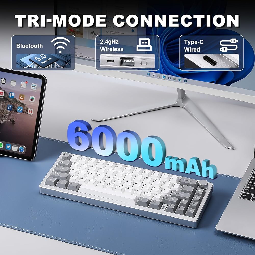 Multi-Device Tri-Mode Wireless Connectivity: Stay connected across multiple devices with AL68. This wireless keyboard supports tri-mode connectivity—Bluetooth, 2.4G wireless, and USB wired, making it compatible with Mac, Windows, Linux and more. Switch seamlessly between up to 5 devices, whether you're using a tablet, laptop, PC, or smartphone. Build-in 6000 mAh battery, enjoy up to 4 days of uninterrupted use when no RGB, making it the perfect companion for on-the-go productivity and gaming.