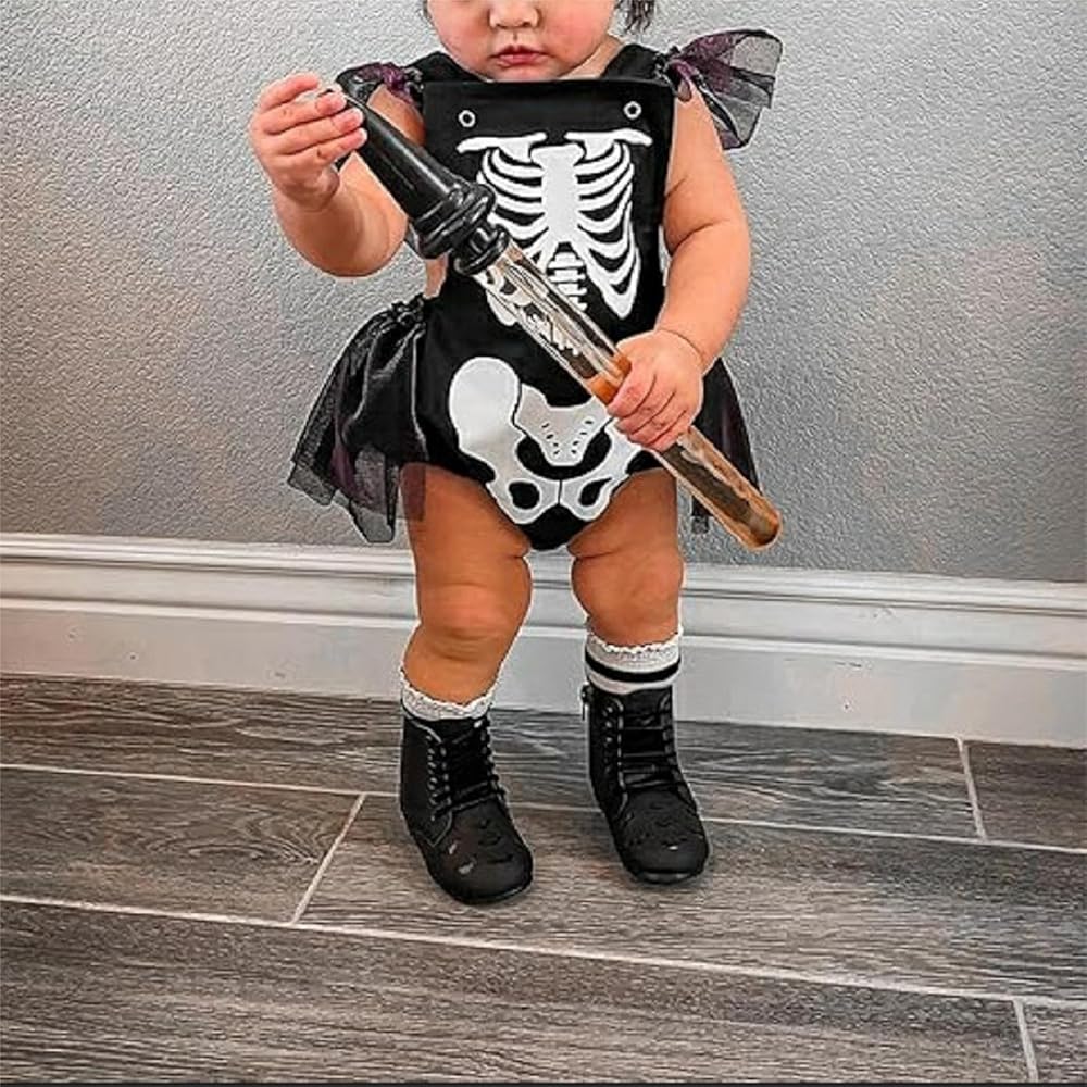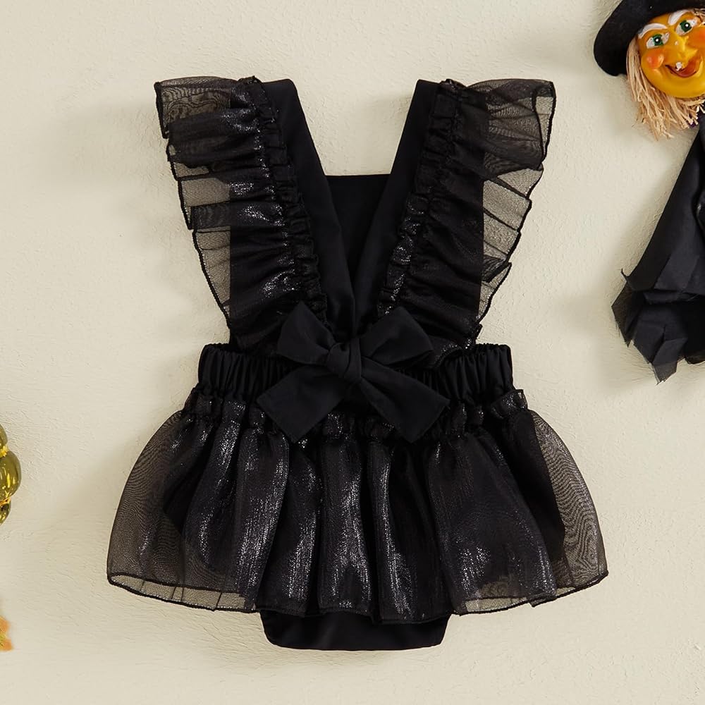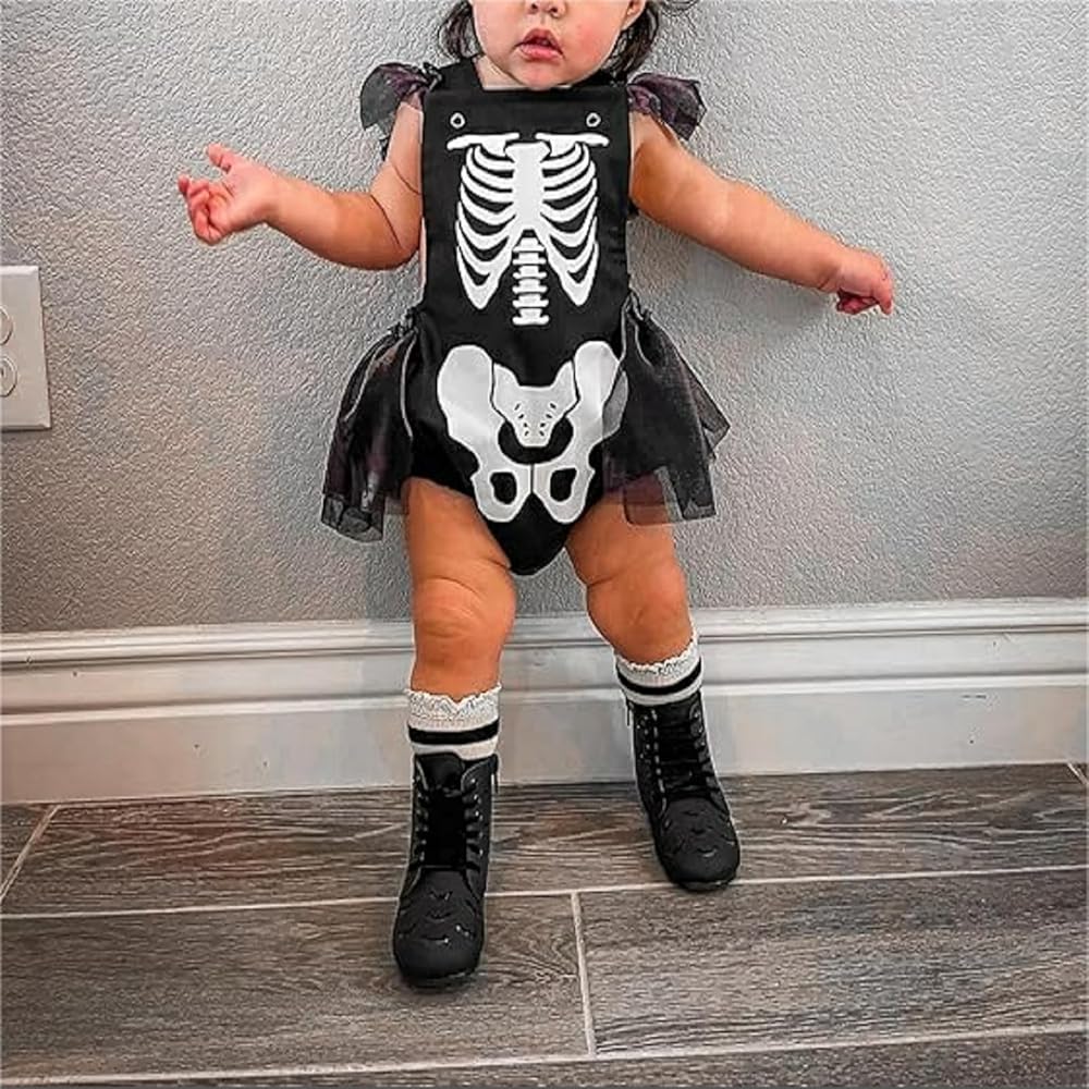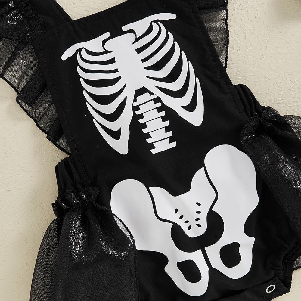 CASUAL DESIGN: Baby girl halloween outfits, halloween baby clothes with skeleton print, fly sleeve bodysuit, mesh tulle tutu romper dress, square neck, bandage on back, bottom button design, easy to put on and take off, baby girl skull romper, baby girl skeleton romper, toddler girl ruffle jumpsuit is the perfect way to add some personality to your baby's closet.
