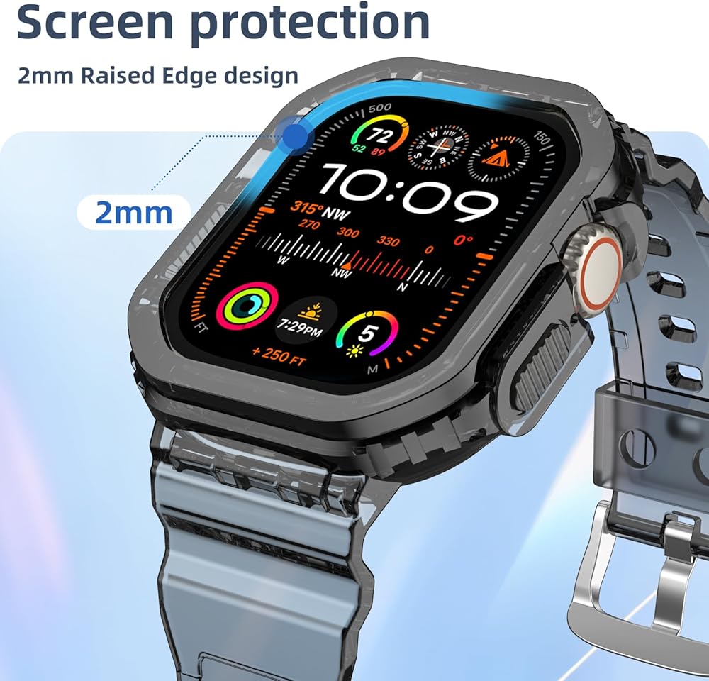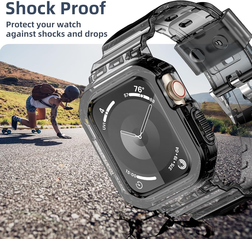 【Uni-Body Safety Design】The Bumper and the crystal clear bands for women compatible with apple watch band are integrated to create a unique fashionable style. The bumper build with 2mm raised edge can protect your smartwatch 360°all round, and the watch band is combined with it so that you will not worry about losing your watch due to connector issues anywhere and anytime