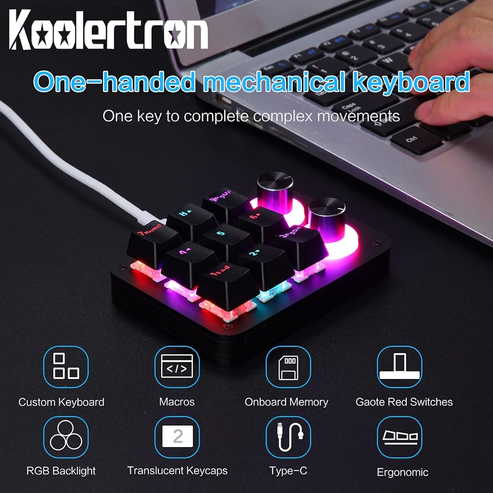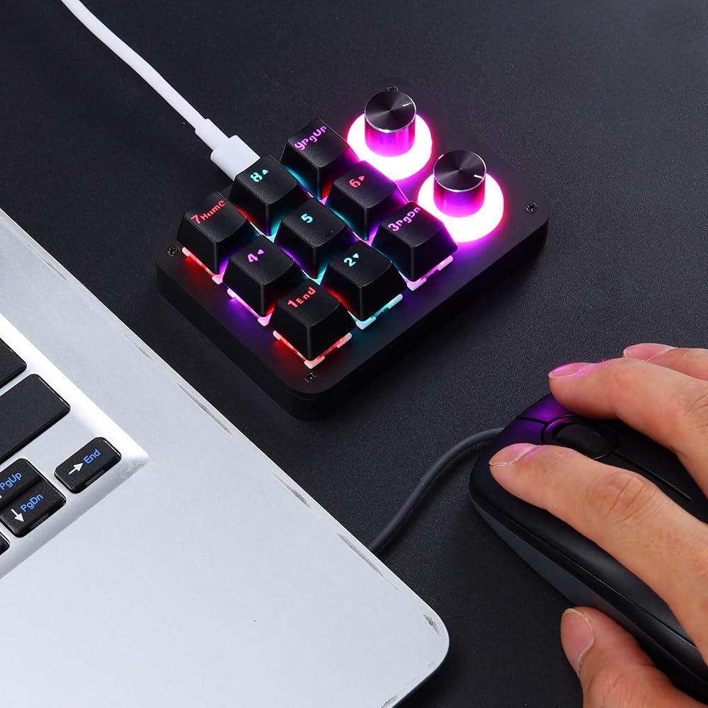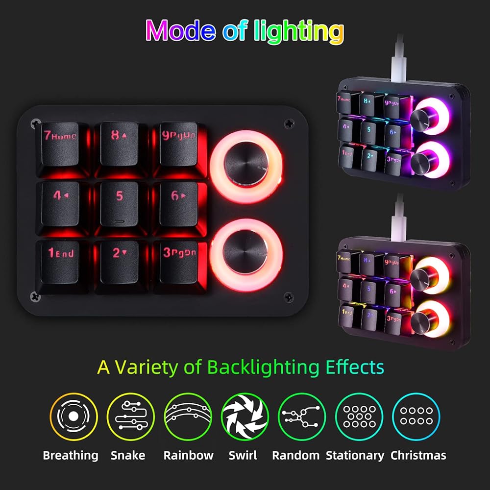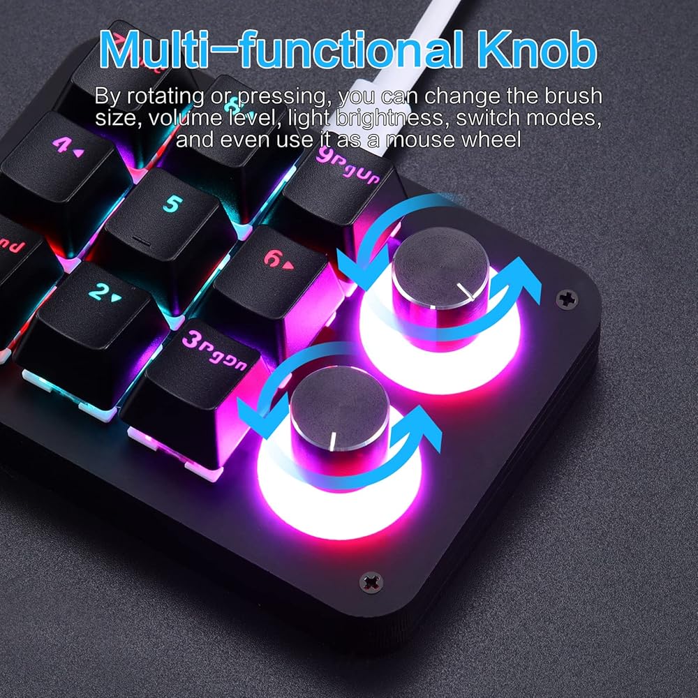 【One Handed Keypad with Unique Knob】Nice quality. Small and portable mini keyboard with unique knob is perfect for making work faster, plays games smoothly etc. The knob (rotate left and right, press down) also can be programmed. Rotate left and right can be infinitely rotated, can be set to ± volume, switch music previous/next, decrease/increase light brightness, switch light mode, turn pages forward/backward etc. you can carry it with you, effectively saving desktop space. If you are not the easy to set up, please just watch videos and you will be fine.